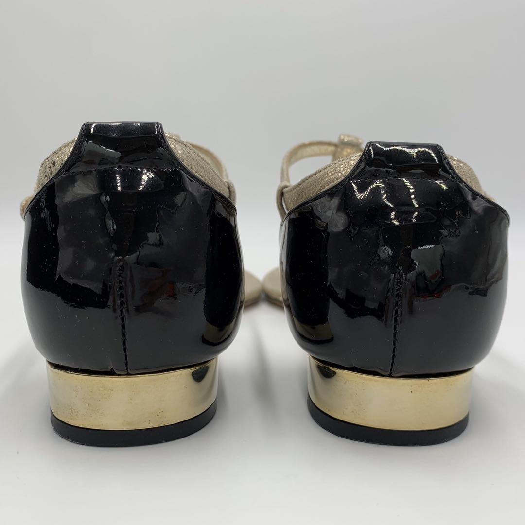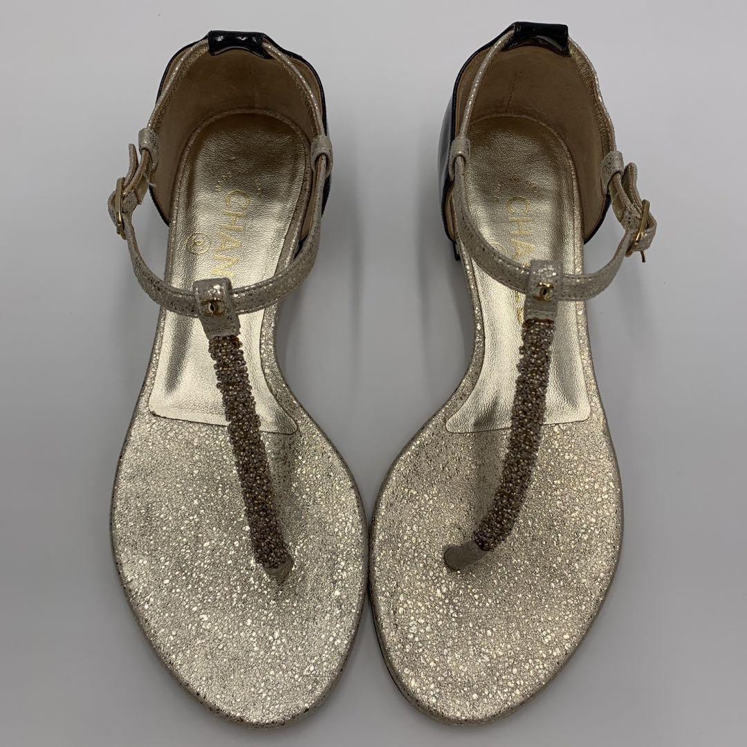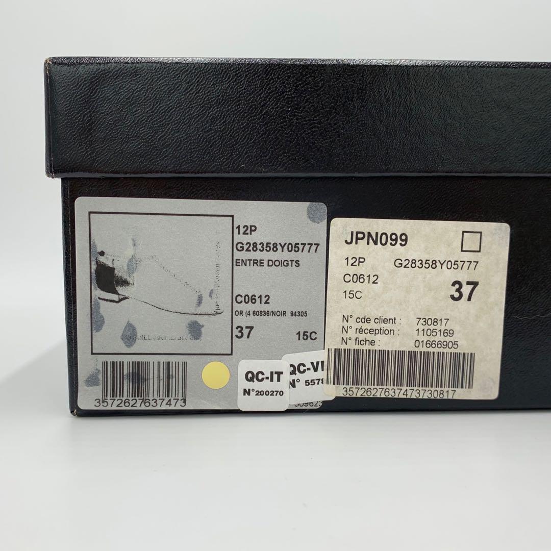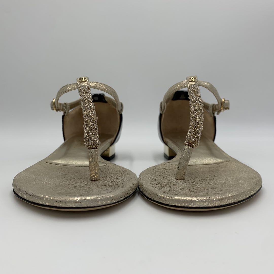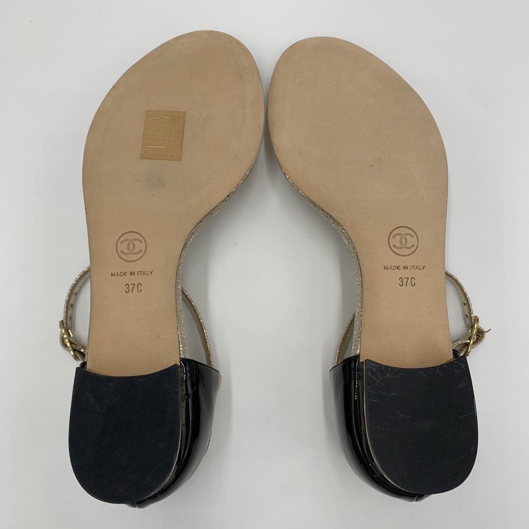 12P シャネル CHANEL Tストラップサンダル トング ローヒール エナメル 切替 ビーズ ラメ ココマーク 37C 黒 シャンパンゴールド