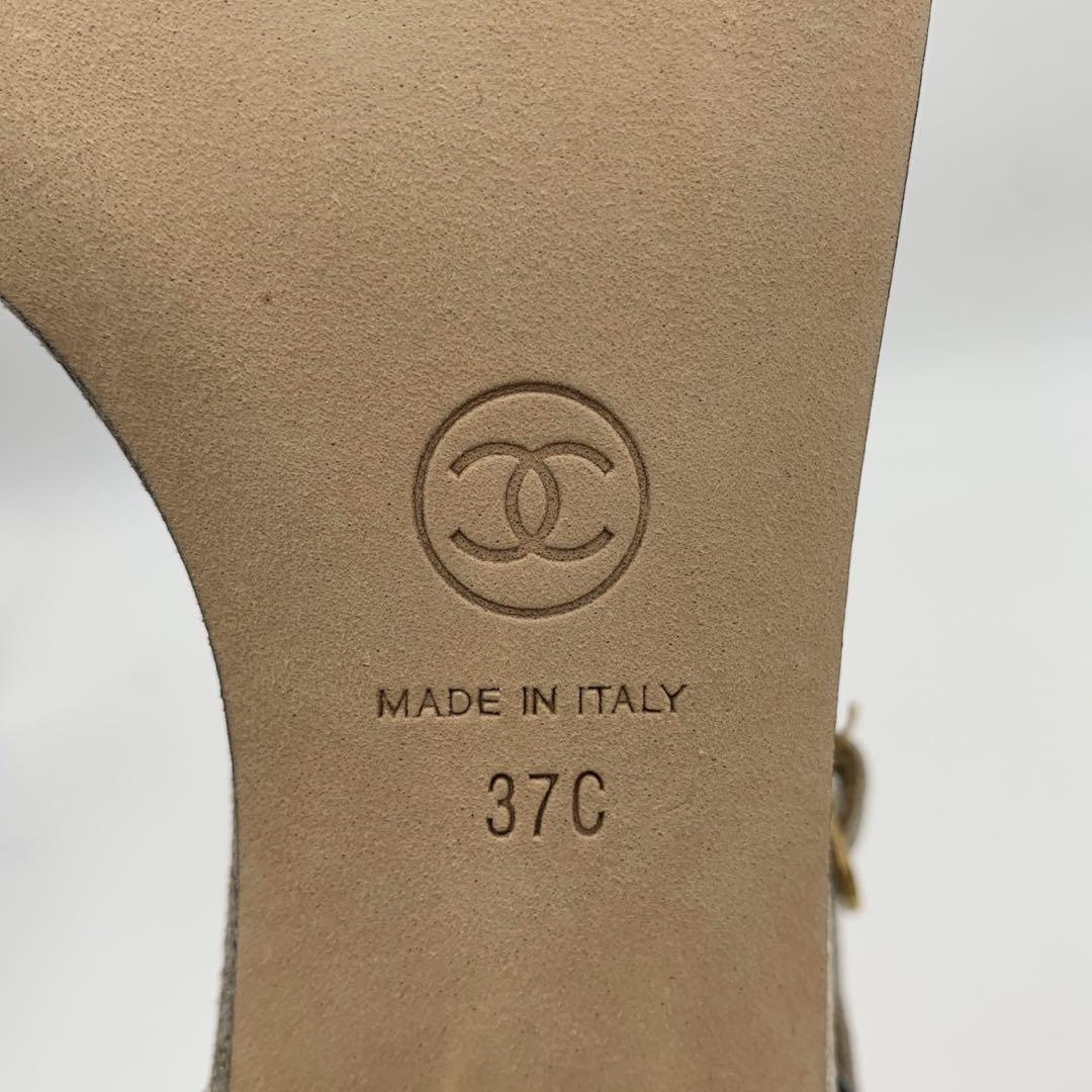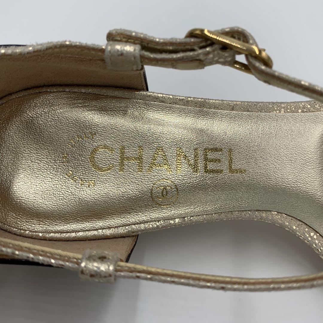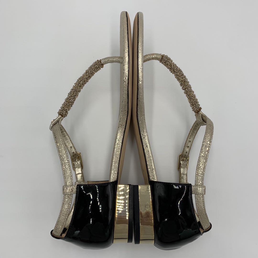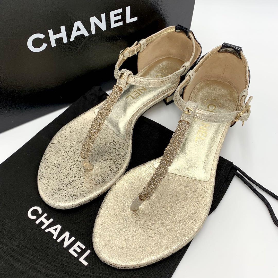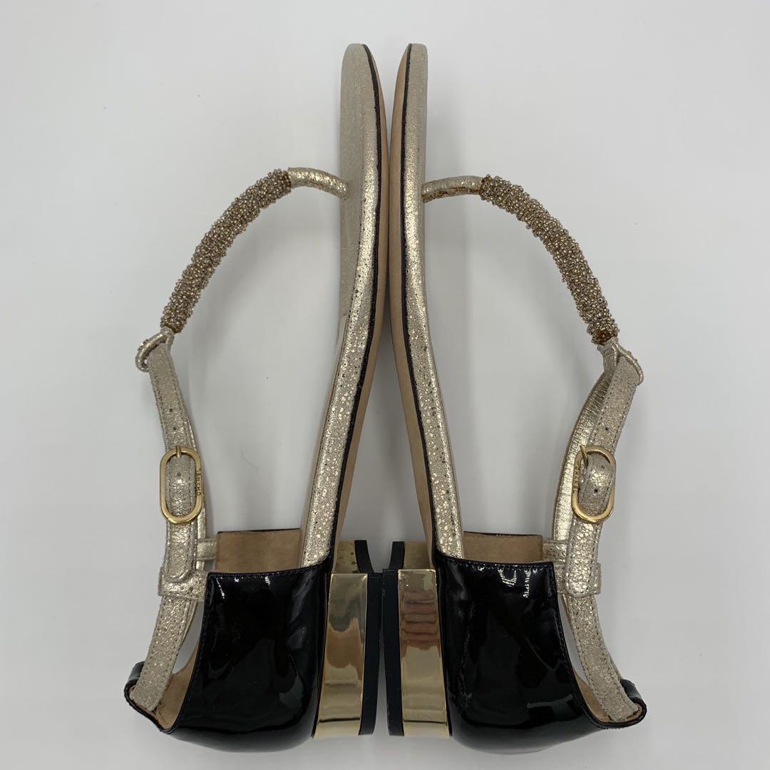 12P シャネル CHANEL Tストラップサンダル トング ローヒール エナメル 切替 ビーズ ラメ ココマーク 37C 黒 シャンパンゴールド