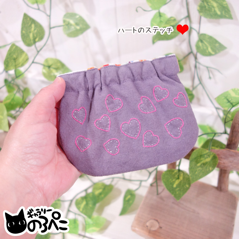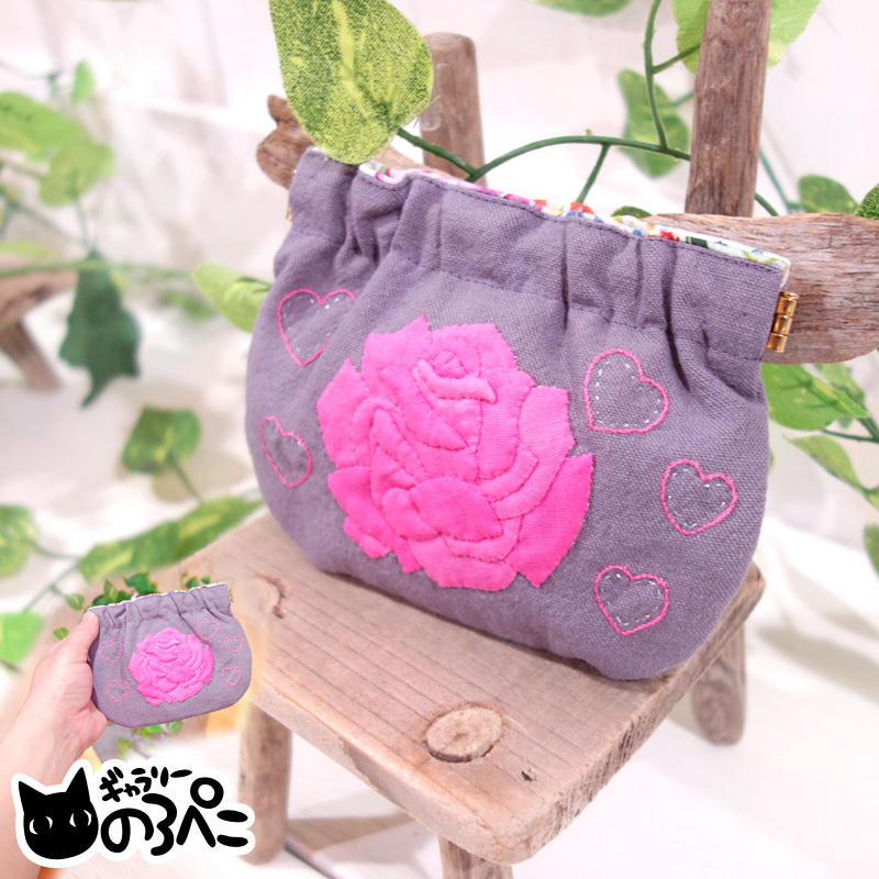 薔薇のパッチワークのバネポーチ(ローズレッドの薔薇の花とハートキルティング・くすみパープル) bc855-224