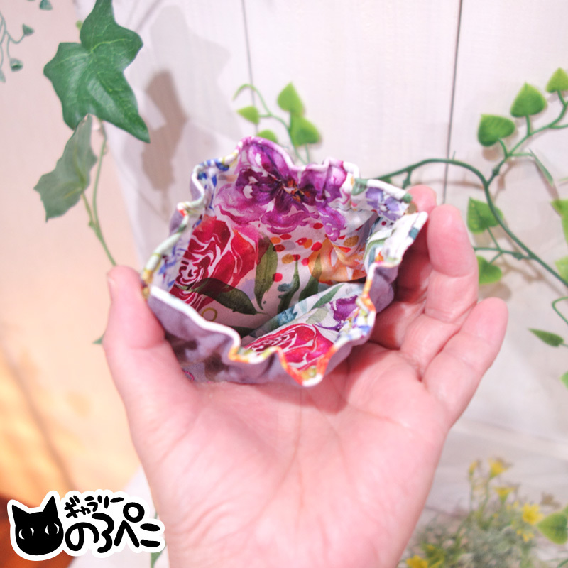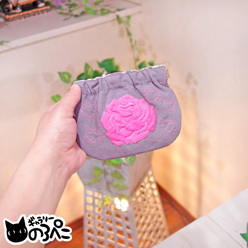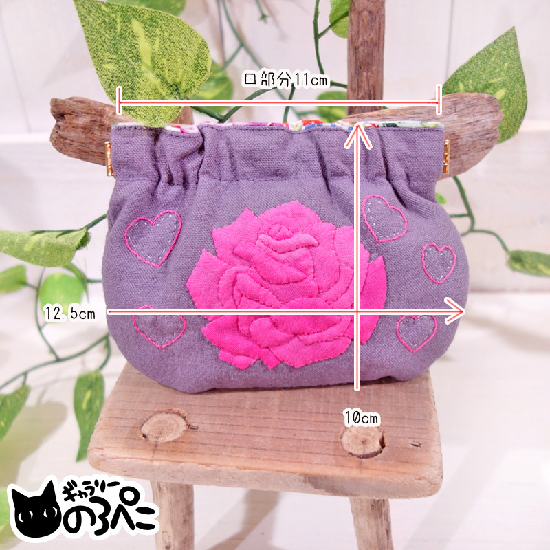 外側はくすみパープルのコットンリネン生地。自然な色と生地の風合いに、ローズレッドの薔薇の花が上品に映えます。薔薇の花は斑染めのコットン生地を使い少し立体感も持たせてあるので、表情豊かで、とてもいきいきとしています。