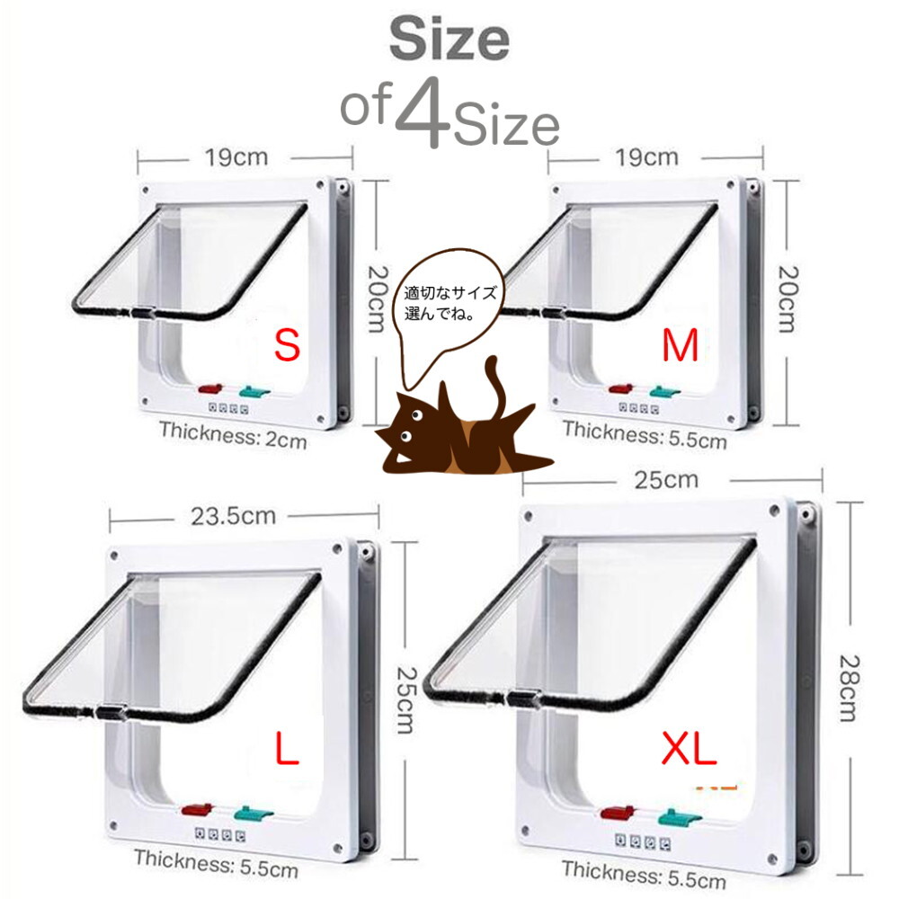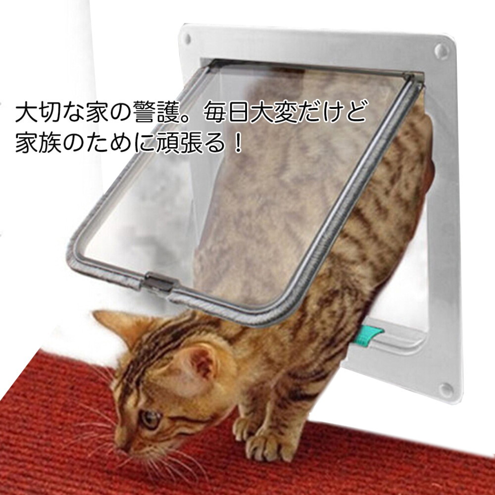 ドアには施錠機能が備わっており、必要に応じてペットの外出を制限できます。夜間や外出時に安心して使用できます。一方通行(外出のみ/進入のみ)、通行自由、通行禁止の4種類の設定が可能です。