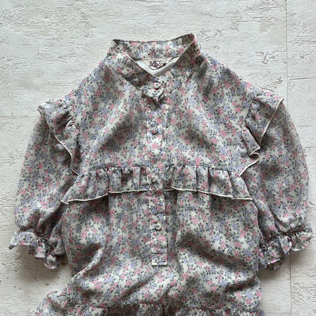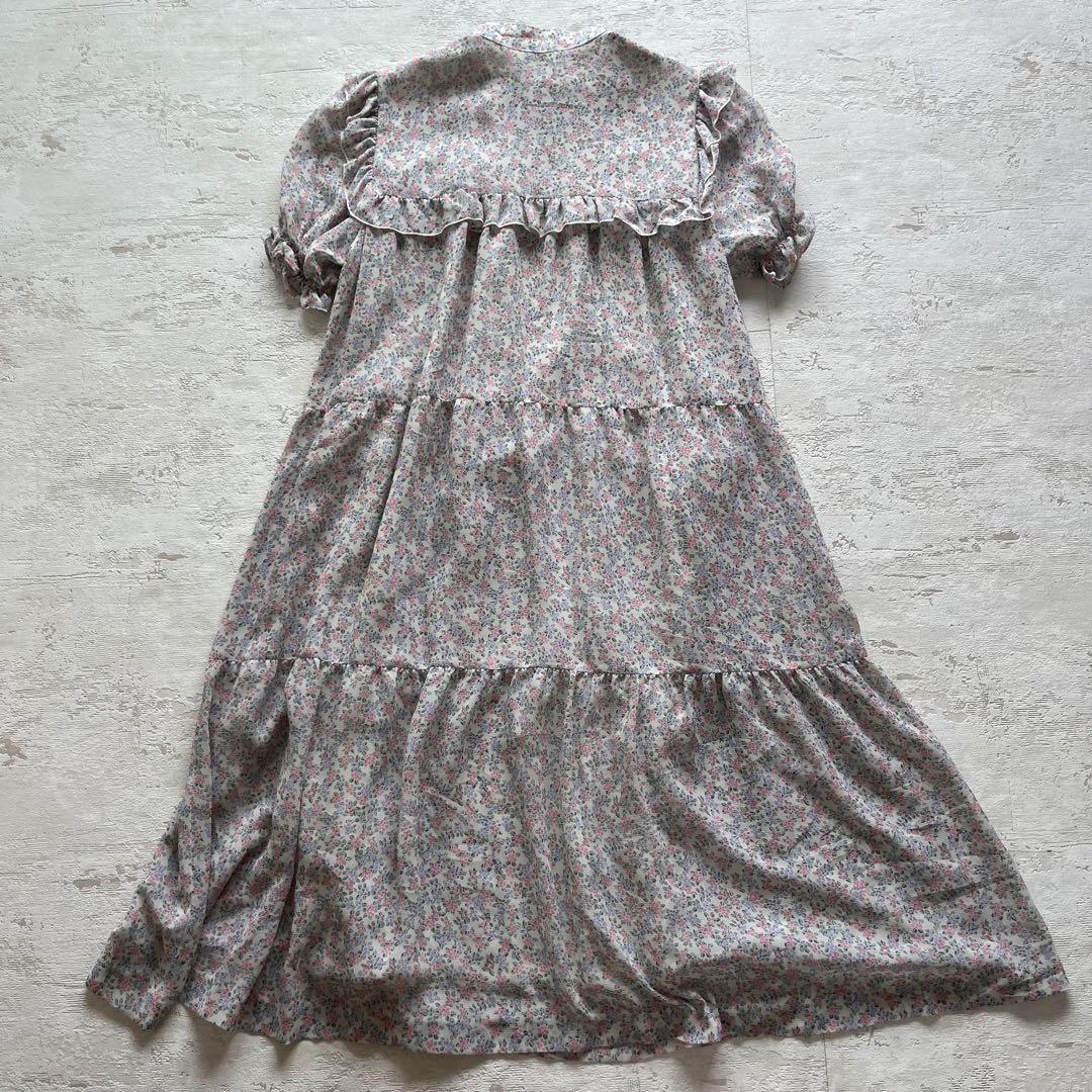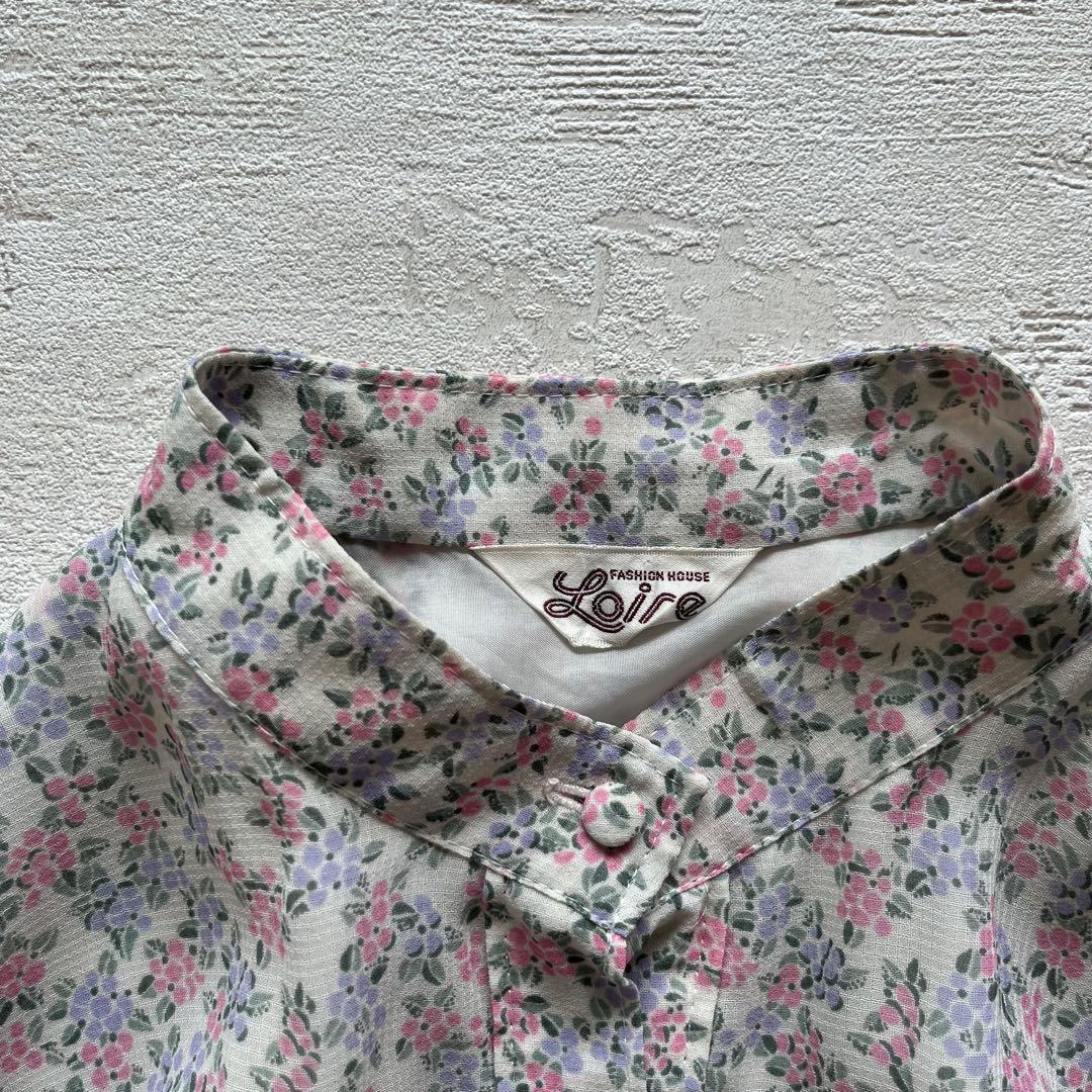 昭和レトロ花柄半袖ロングワンピーススタンドカラーフリル付きホワイト9号n1