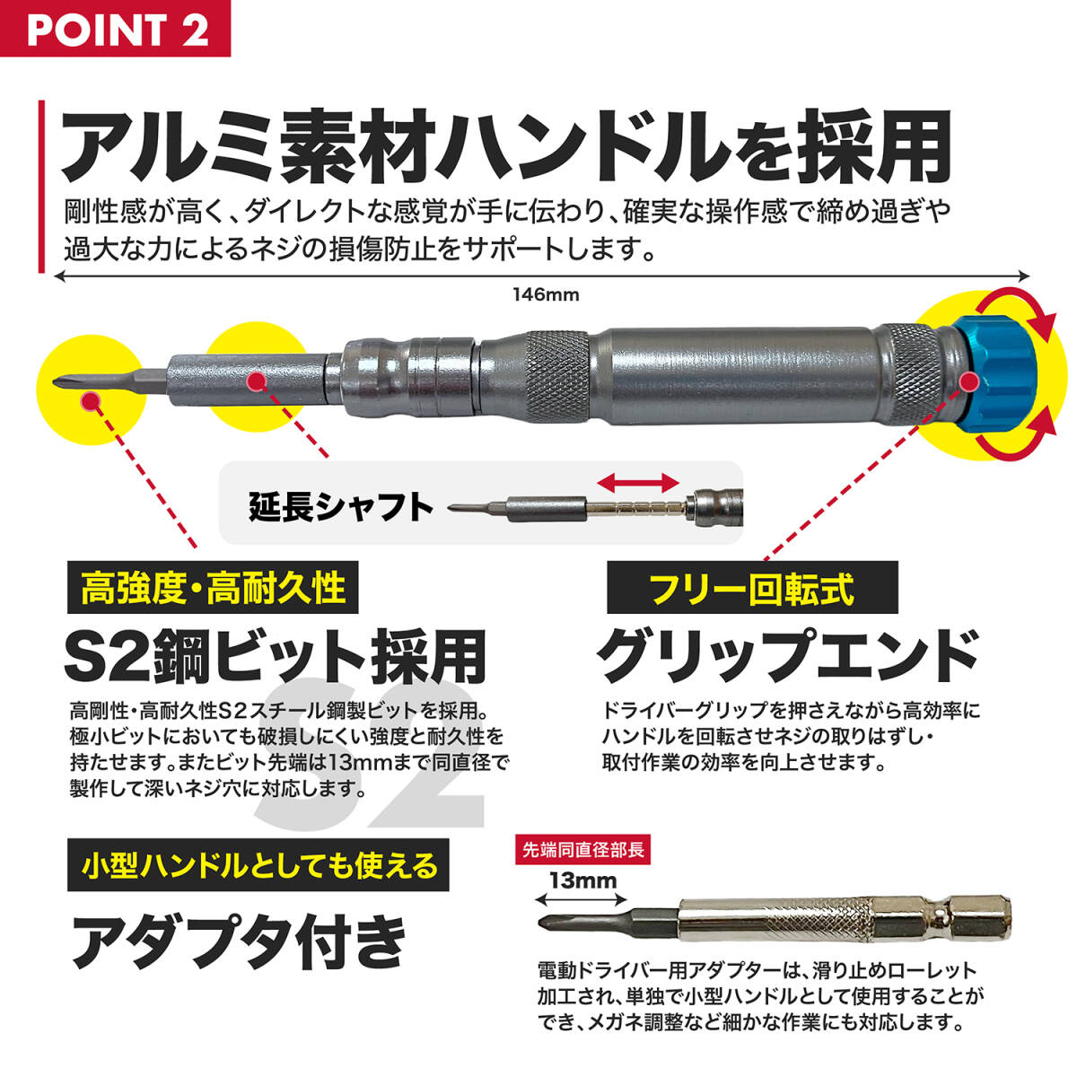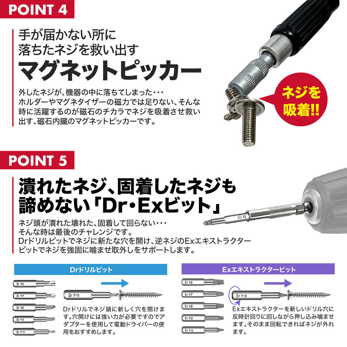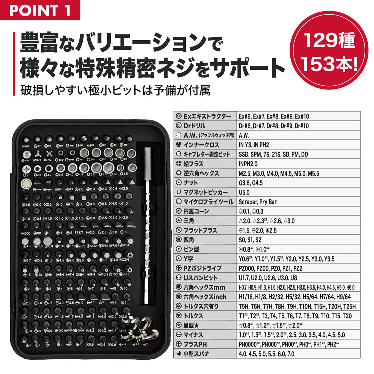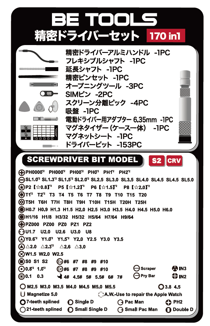 ■豊富な先端バリエーション: Exエキストラクター(#610), Drドリル(#610), A.W. (アップルウォッチ用), インナークロス(INY3,INPH2), キャブ調整(SSD,SPM,7S,21S,SD,PM,DD), 逆プラスINPH2.0, 逆六角ヘックス(M2.5-5.5), ナット(G3.8-4.5), マグネットピッカー, マイクロプライツール(Scraper,PryBar), 円錐コーン(0.1,0.3), 三角(2.0-3.0), フラットプラス(1.5-2.5), 四角(S10-3), ピン型(0.8,1.0), Y(Y0.6-3.5), PZポジドライブ(PZ000-PZ2), Uスパンビット(U1.7-8), 六角ヘックスmm(H0.7-6.0), 六角ヘックスinch(H1/16-9/64), トルクス穴有(T5H-25H), トルクス(T1-20), 星型(0.8-2.0), マイナス(SL1.0-5.0), プラスPH(PH0000-2), 小型スパナ(4.0-7.0)