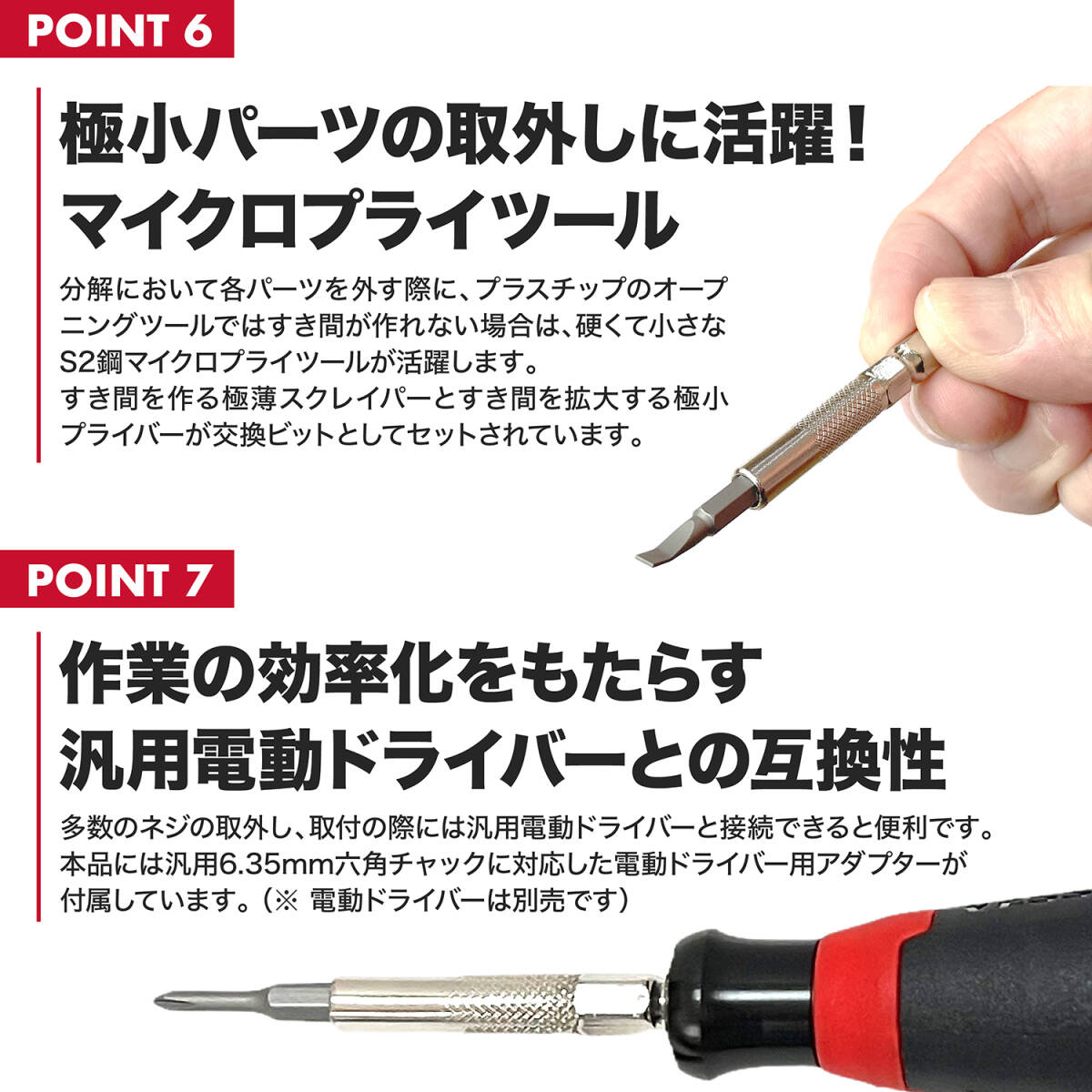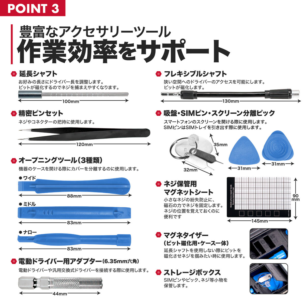 ■分解作業をサポートする豊富なアクセサリー: 精密ピンセット, 延長シャフト, フレキシブルシャフト, 電動ドライバー用アダプター6.35mm, マイクロプライツール、オープニングツールー, スクリーン分離ピック, 吸盤, SIMピン, マグネタイザー(ビット磁化用), ネジ保管用マグネットシート