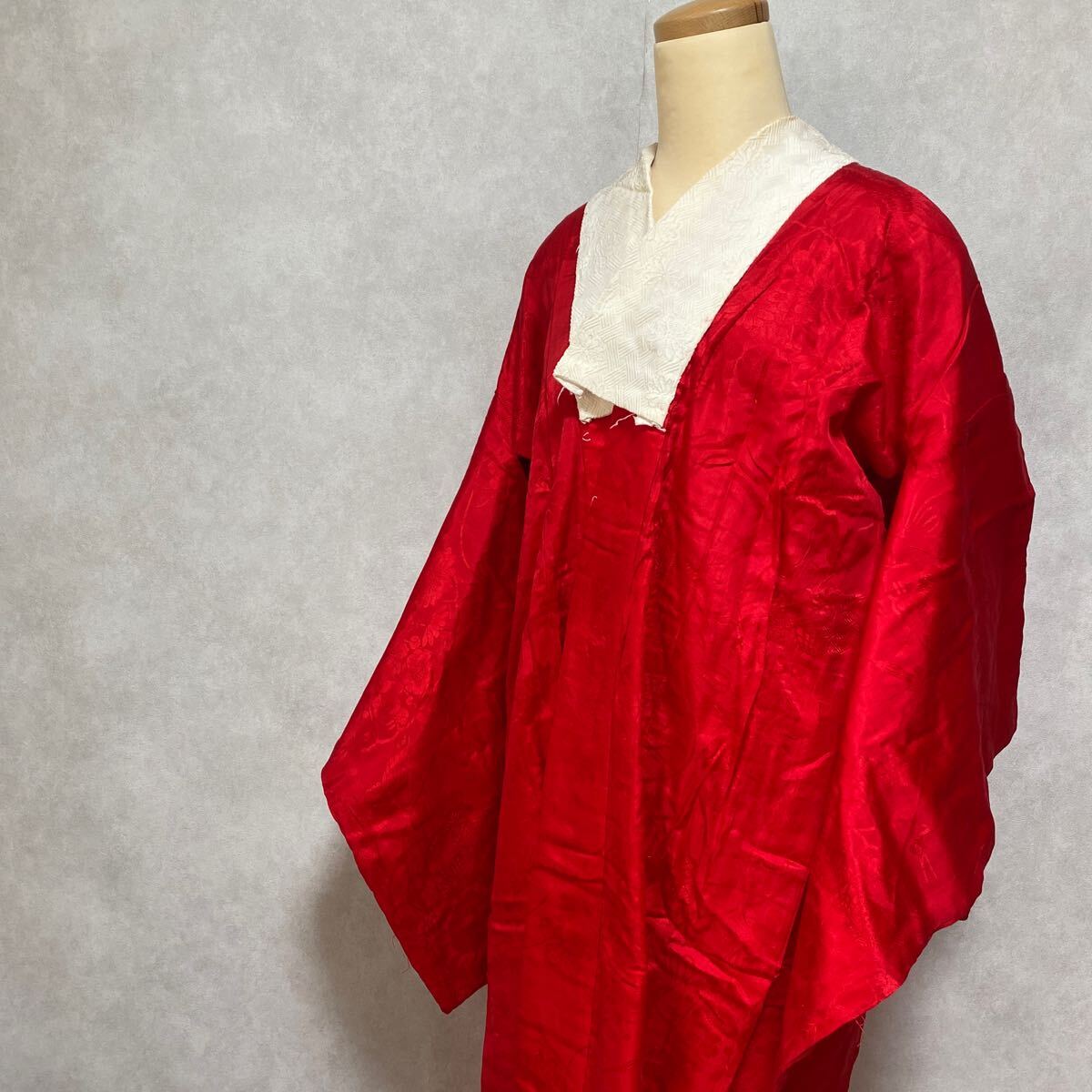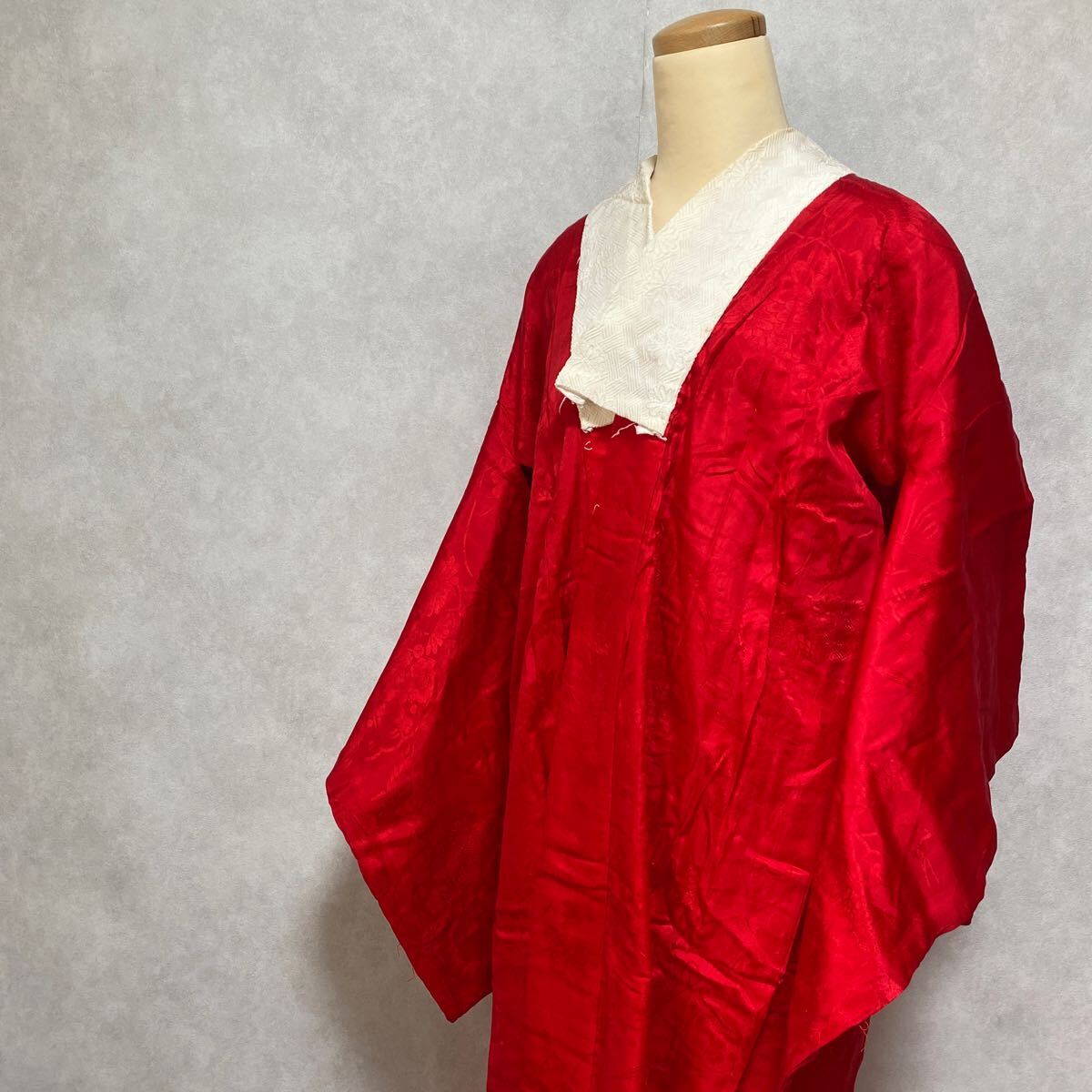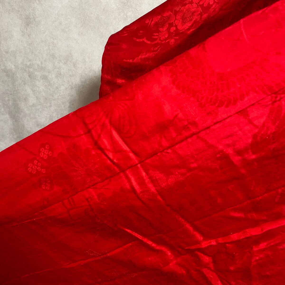 長襦袢 アンティーク 着物 地紋 扇子 鶴 赤色 昭和レトロ 大正ロマン モダン リメイク 絹 正絹100% く04-05y