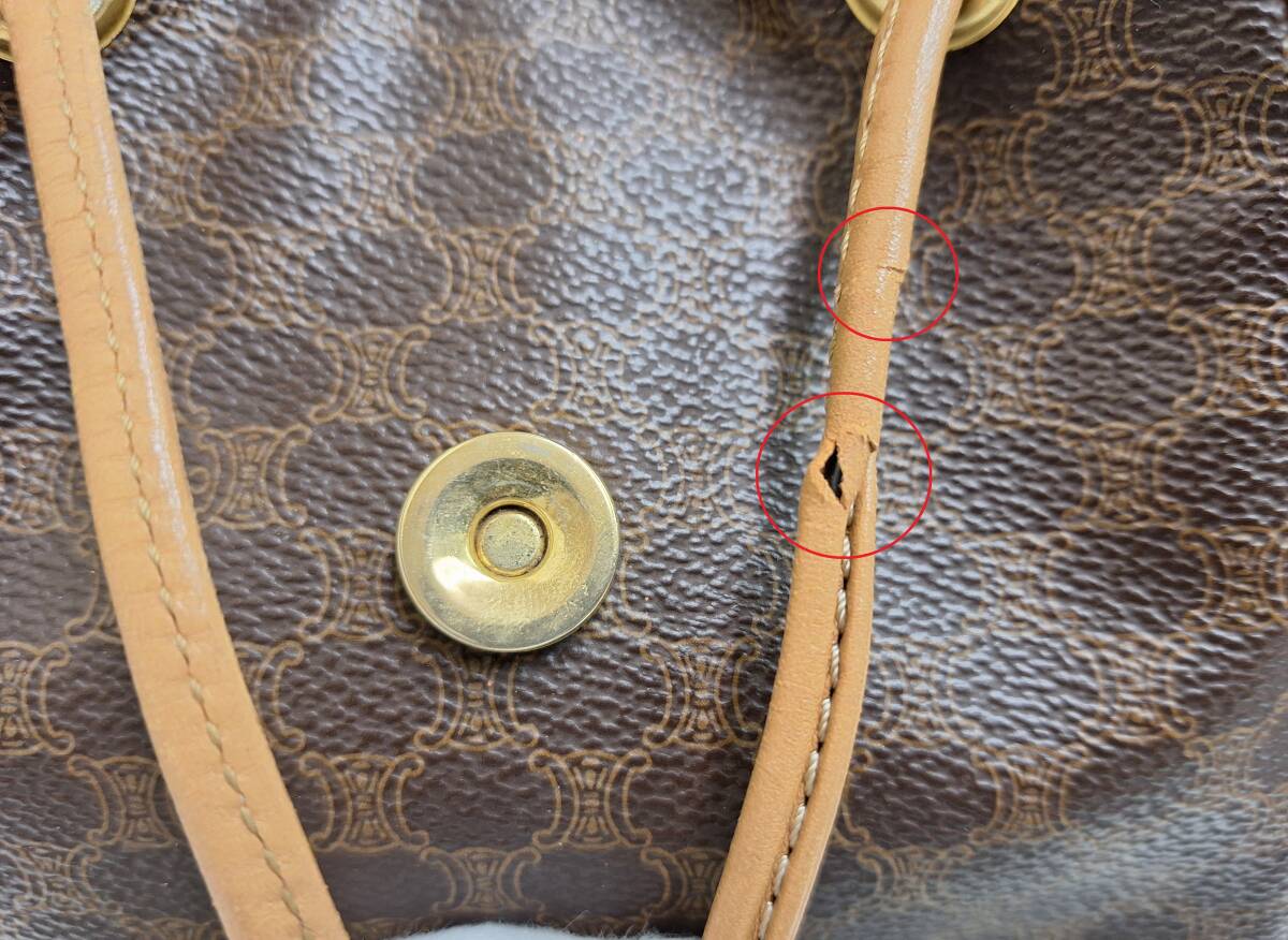 ■状 態 金具に細かなキズやくすみはありますが、ショルダーストラップや角スレ等も含め内外共に大きなダメージは無く、全体的に比較的綺麗な状態です。開口部の綴じ紐の一部に破損(破れ)箇所があります。画像にてご確認ください。