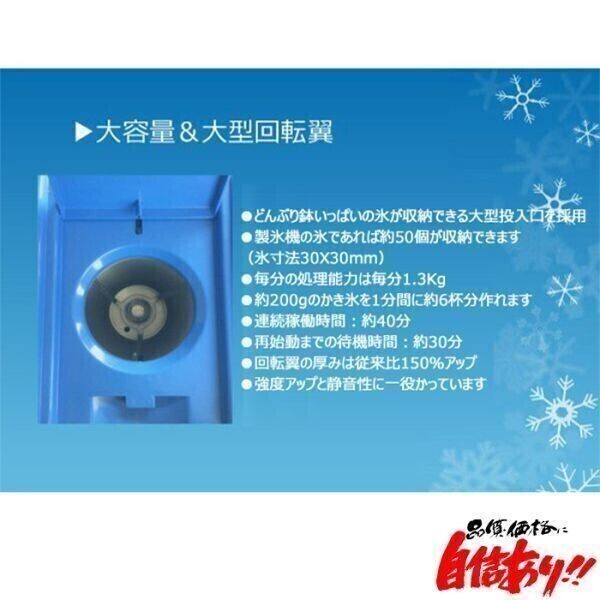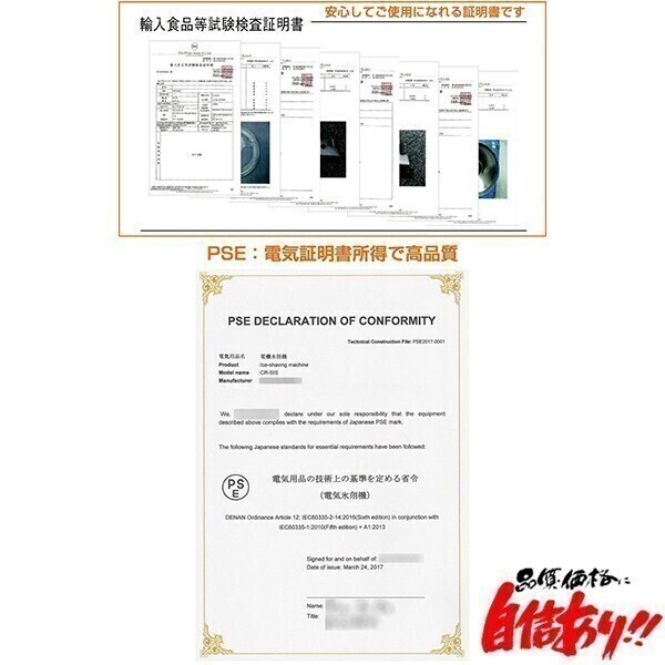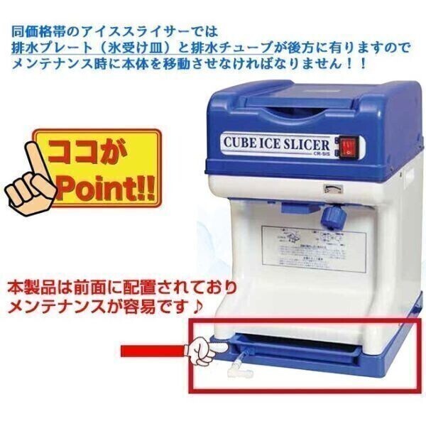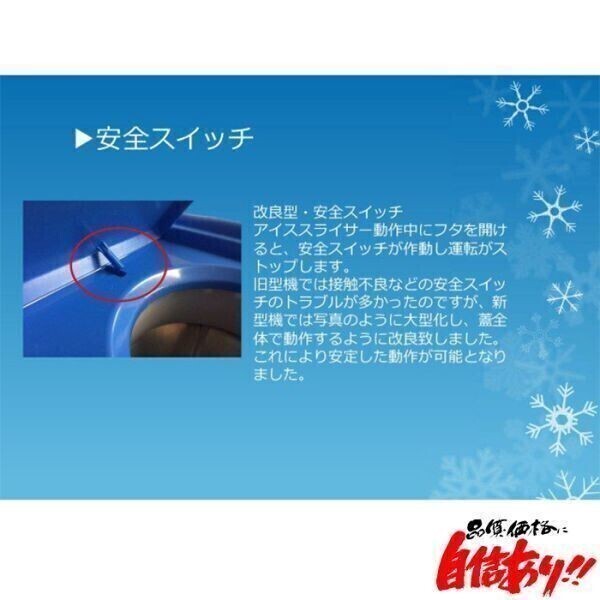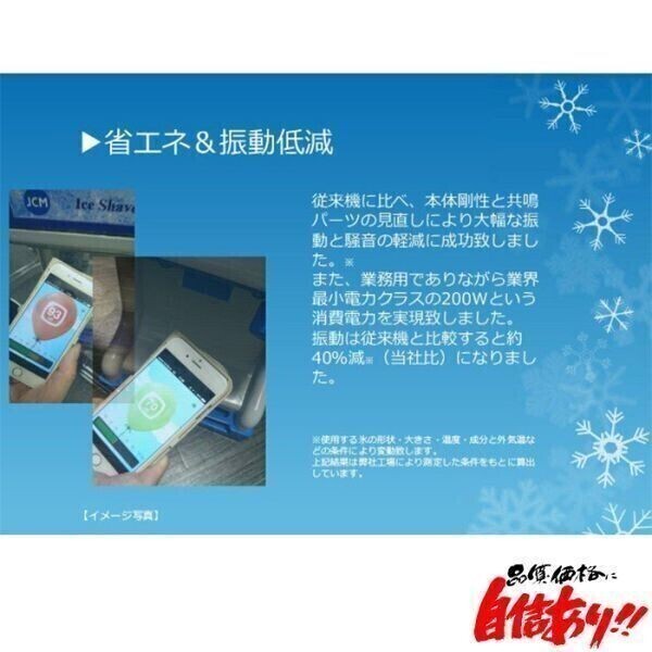3年連続!!年間販売台数1000台オーバーの実績!! 日本製電装部品使用 ![]() ![]() ★コンパクト&ビッグパワー★ ●外観はコンパクトでありながら業務用で使用できるビッグモーターを採用 ●A3サイズに収まるサイズでコンパクトな厨房にも収まるサイズです ●本体重量16Kg ★省エネ&振動低減★ ●本体剛性と共鳴パーツの改良により大幅な振動と騒音の軽減に成功しました ※使用する氷の形状・大きさ・温度・成分と外気温などの条件により変動致します ※上記結果は製造メーカー工場により測定した条件をもとに算出しています ●業務用でありながら業界最少電力クラスの200Wという消費電力を実現!! ●振動は従来機と比較すると約40%減になりました。(同一メーカー比) ★大容量&大型回転翼★ ●どんぶり鉢いっぱいの氷が収納できる大型投入口を採用 ●製氷機の氷であれば約60個が収納できます(氷寸法30X30mm) ●毎分の処理能力は毎分1.3Kg ●約200gのかき氷を1分間に約6杯分作れます ●連続稼働時間:約40分 ●再始動までの待機時間:約30分 ●回転翼の厚みは従来比150%アップ ●強度アップと静音性に一役かっています ★安全スイッチ★ ●改良型の安全スイッチを採用!! ●アイススライサー動作中にフタを開けると安全スイッチが作動し運転がストップします 【商品仕様】 製品名:CUBE ICE SLICER 品番:CR-SIS 外形寸法:W280×D360×H450mm(蓋開け時675mm) 電源:単相100V 50Hz/60Hz 消費電力:200W/180W 定格電流:2.7A/2.0A 氷削能力:1.3Kg/min 氷収容量:約60個(氷寸法30X30mm) 連続稼働時間:約40分 再始動までの待機時間:約30分 本体重量:16Kg 本体素材:ABS樹脂 内部素材:ステンレス 回転翼:強化樹脂製※強度テスト済 付属品:排水管・予備替え刃1枚・替え刃取り換え用スパナ 製造元:エコレイズ株式会社 製造国:韓国 保証:保証規定に基づくメーカー1年保証(消耗品は除きます) ※製品の仕様は品質向上のため予告なしに変更する場合があります※ ![]() ![]() |