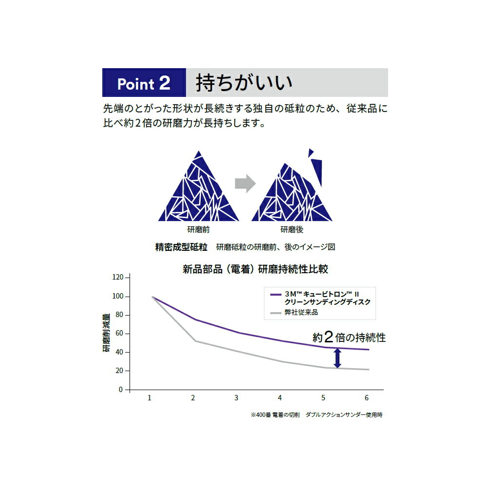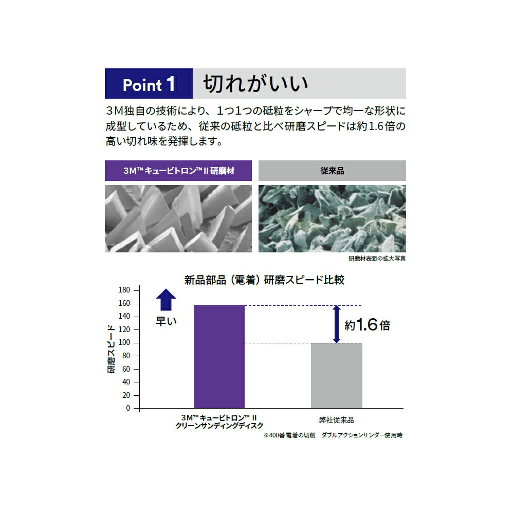 ・3M精密成型砥粒を採用。三角形の砥粒で、従来のセラミック研磨材に比べて少なくとも30%速く切削でき、30%以上長持ち