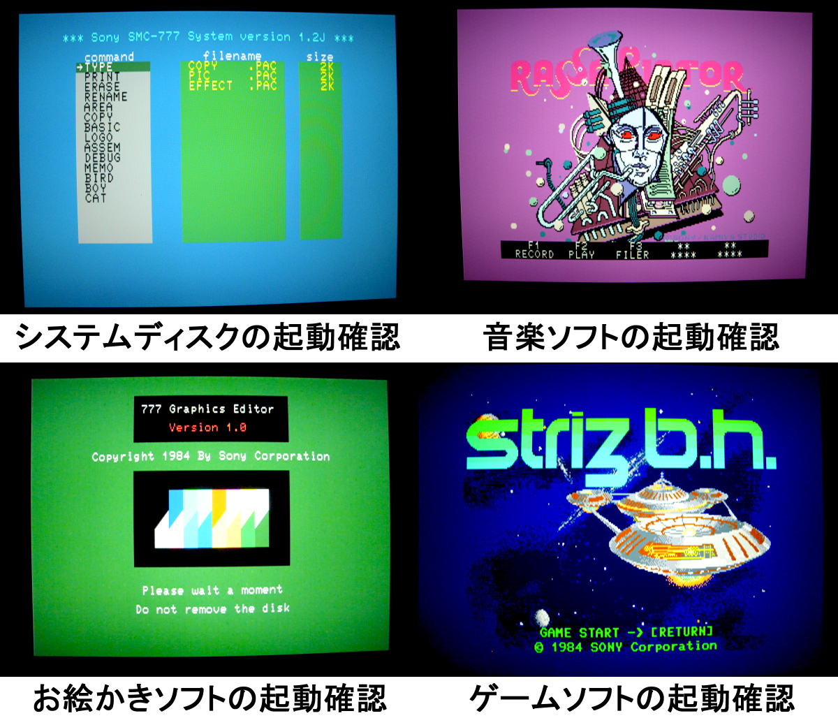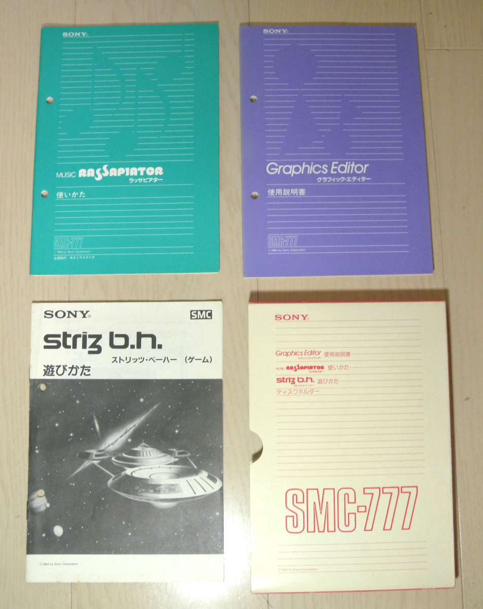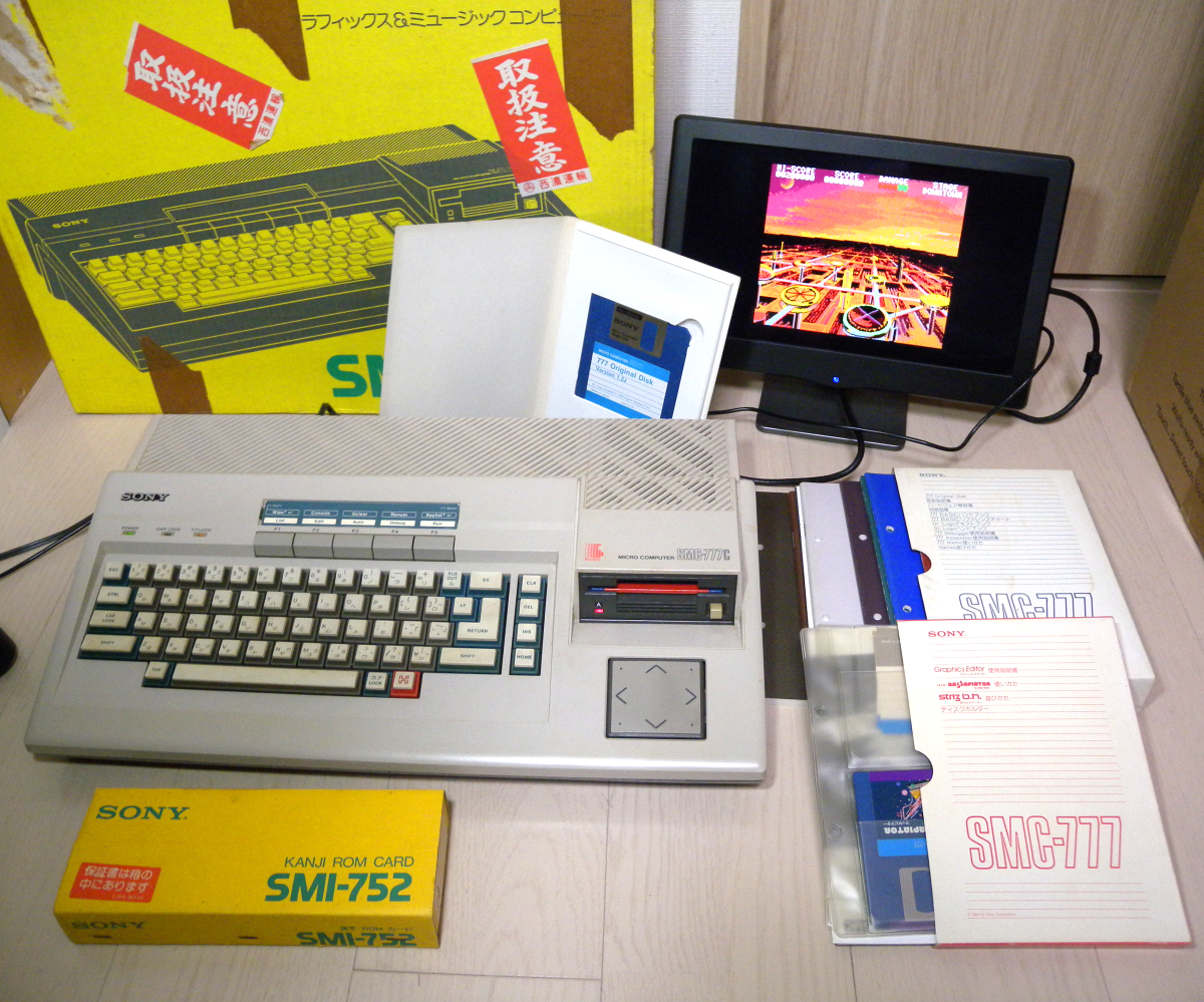 ●他メーカーに先駆けてアナログRGBや 16色モードを採用したSONYの野心的な 8ビットパソコン、SMC-777Cです。 ●全部で15種類もあるマニュアルや4枚の アプリケーションディスク、ラッサピアター用 のキーボード・オーバーレイシート、元箱 など購入時に付属していたものは、ほぼ すべて残っています。 ●オプションの漢字ROMカードも本体に 取付け済です。 ●フロッピーディスクドライブは古いグリスを 除去して新しいグリスを塗ってあります ので正常に動作します。 ●SMC-777CのRGB接続端子は25ピンの 特殊なコネクタですが、これをVGA 15ピンに変換するアダプタ(同人製)を お付けします。ただし、水平同期周波数 15kHzに対応したモニターが必要です。 ●本体は日焼けもほとんどなく、きれいな 状態です。背面の端子にもサビはなく、 金属光沢が残っています。 ●出品にあたり、以下の点を確認しました。 ・アナログRGBで正常に画面表示できること ・4枚の本体添付ディスクすべてが 正常に起動できること ・ディスクの出し入れができること ・漢字が表示できること ・英数字、カーソル、リターンキーなど 主要なキーが入力できること ・マニュアル類がすべて揃っていること ●付属品 ・SMC-777C本体 ・漢字ROM(取付け済) ・マニュアル類一式(スリーブ入り) ・元箱(本体、漢字ROMカード) ・カセットテープ用ケーブル ・ラッサピアター用オーバーレイシート ・RGB出力変換アダプタ ・純正の本体保護カバー(汚れあり) ●動作確認、写真撮影に使用した モニターやRGBケーブルは出品物に 含まれません。 ●付属品がすべて揃っているSMC-77C はほとんどオークションに出てこないので この機会にいかがでしょうか ●元箱に入れて段ボール紙とプチプチで 包んで発送します。 ●現在、SMC-777用のソフトも出品中 です。 | ||