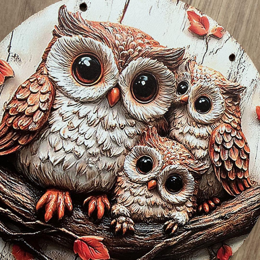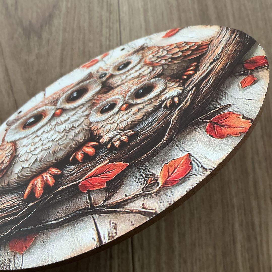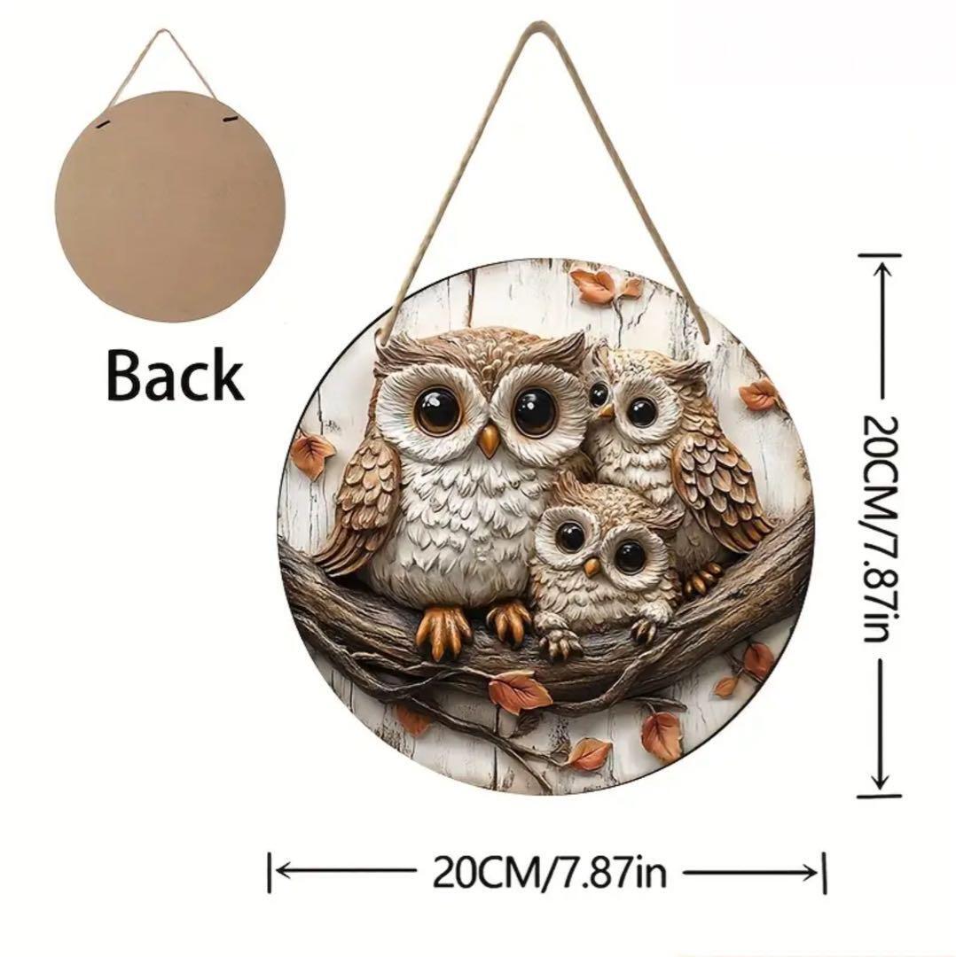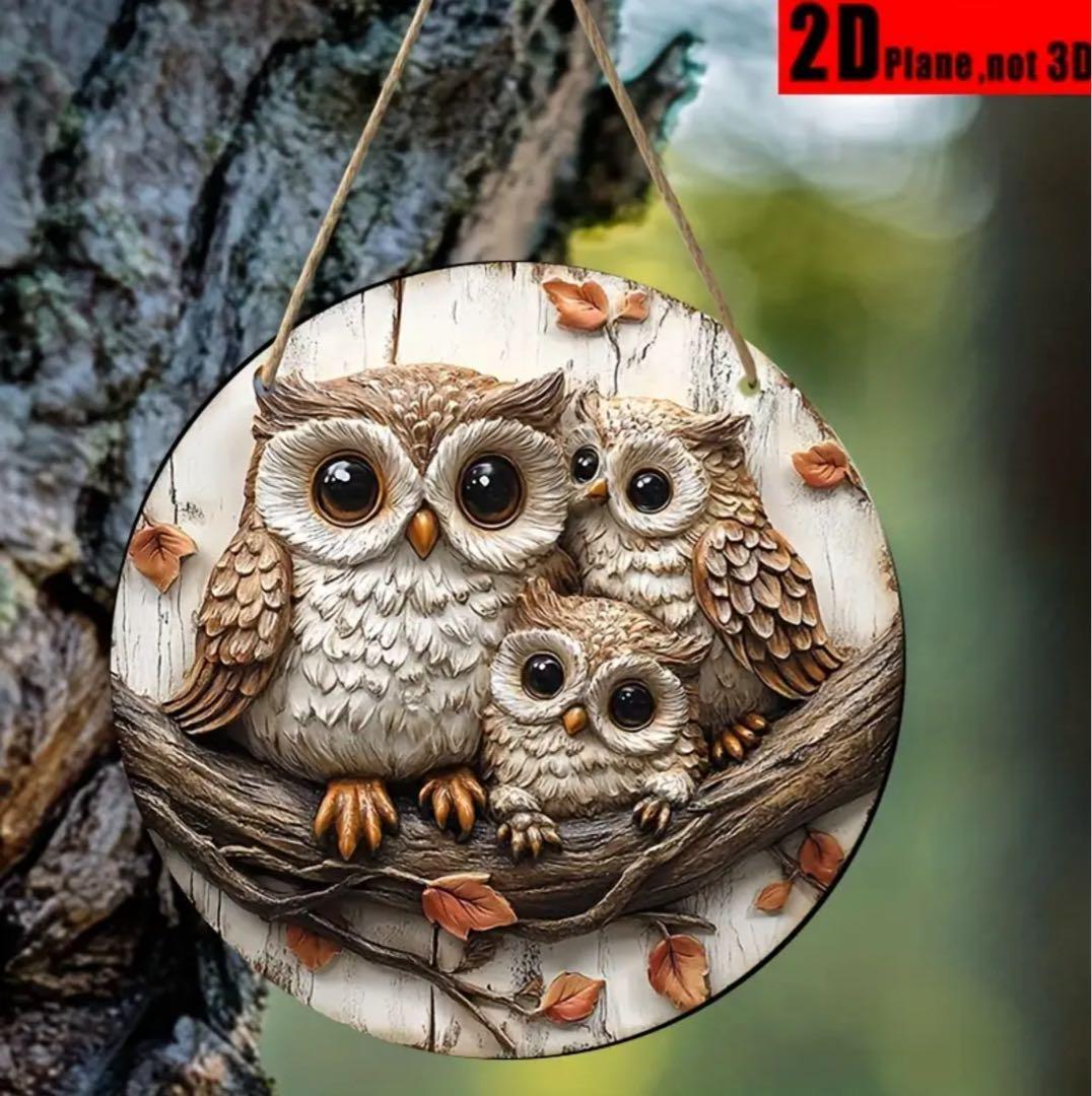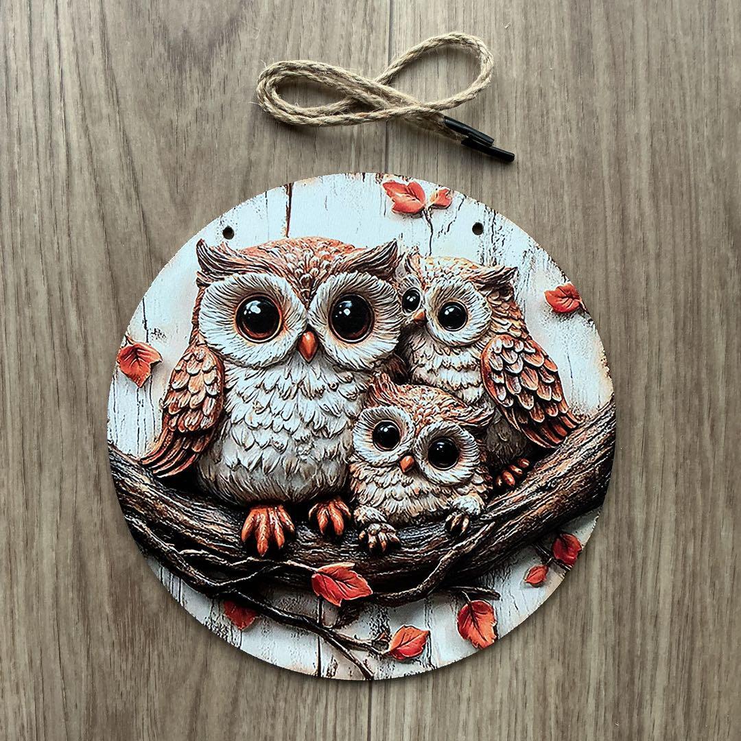 ■新品■木製プレート【看板】ガーデンオブジェ【ふくろう】ファミリー3【円形】フクロウ ガーデニング 雑貨 オーナメント 飾り