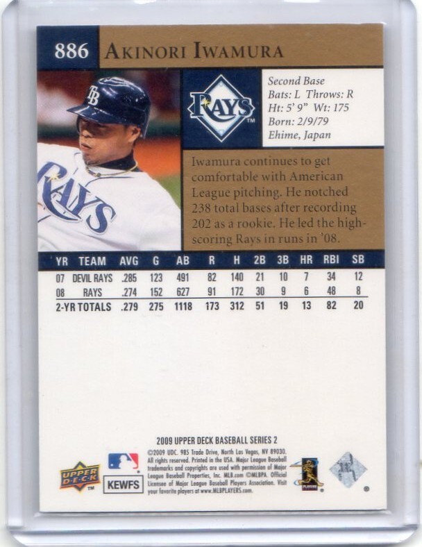 2009UD BASEBALL SERIES 2 #886 ----------------------------------------------------------- ■岩村明憲 MLB成績 4年 2007-10年 デビルレイズ/レイズ パイレーツ アスレチックス 408試合 413安打 16本塁打 32盗塁 打率.267 2008年ワールド・シリーズ出場 岩村ファンの方、是非どうぞ! |
