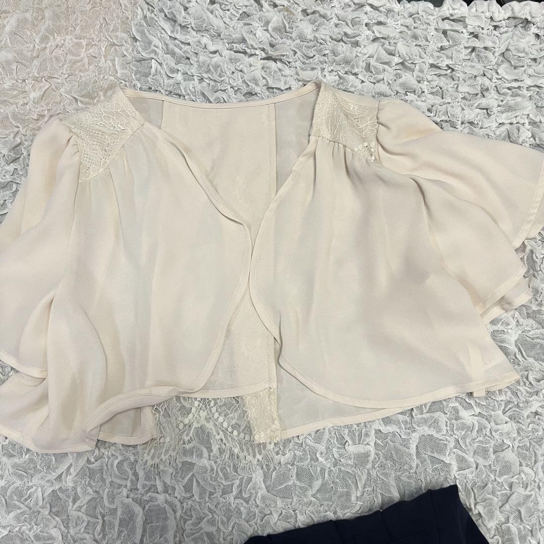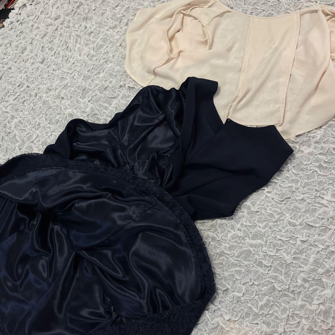 アクシーズのパール装飾と裾レース装飾の上品なネイビーのドレスに、シンプルで上品なアローのボレロをセットにしました。