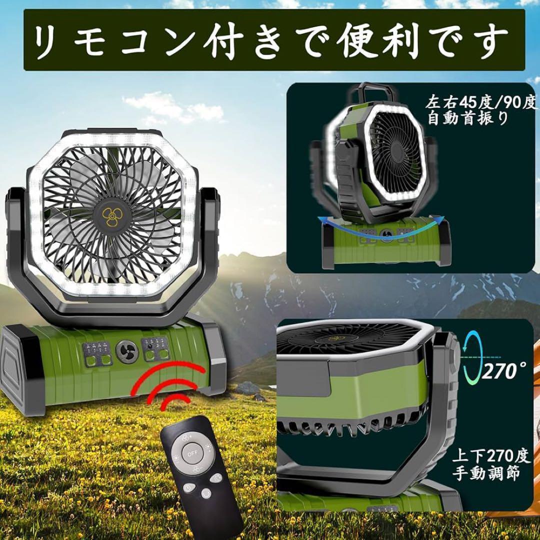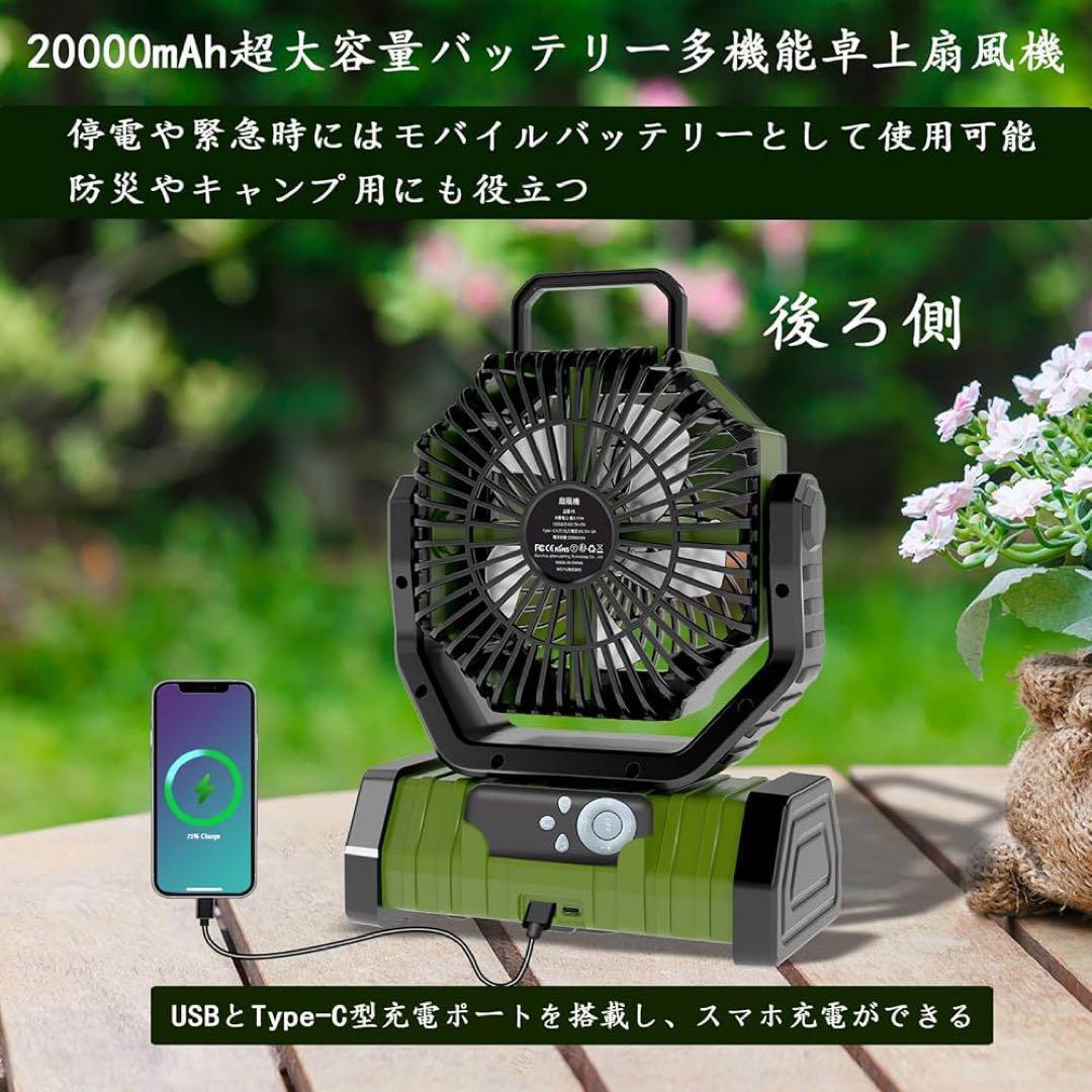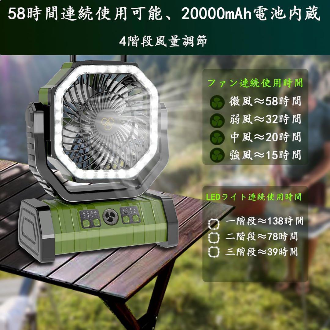 20000mAhの超大容量のリチウムイオンポリマー電池を内蔵され、1回フル充電時で、最小モードで58時間連続使用が可能です。最大モードでも約15時間の連続使用が可能です。4段階風量調節可能、微風、弱風、中風、強風4つのモードがあり、お好みの風でリラックスできます。キャンプ扇風機は高輝度LEDライトも搭載し、低輝度で最大約138時間の点灯が可能です。ライトの輝度を3段階調節することができます。風量も輝度もお好みに合わせて調整できます。