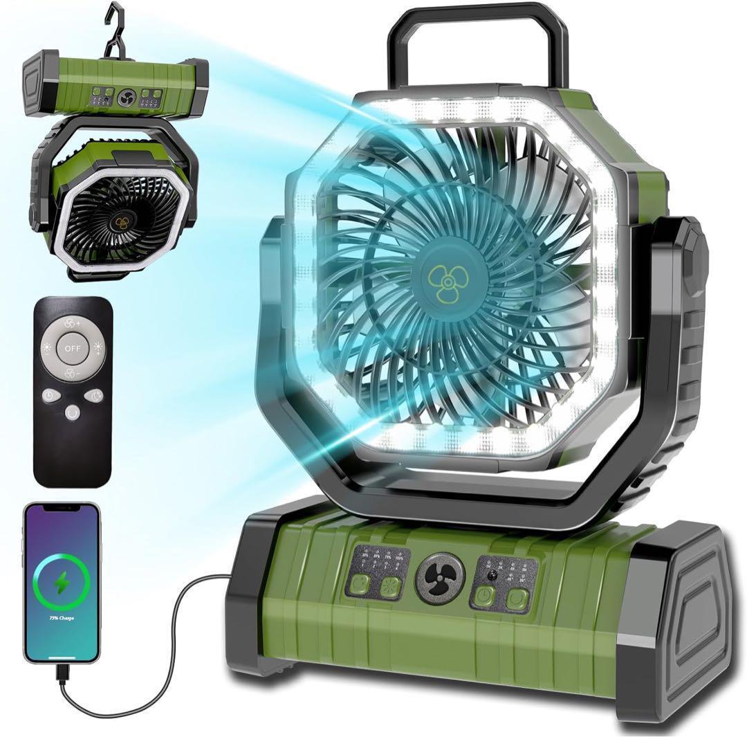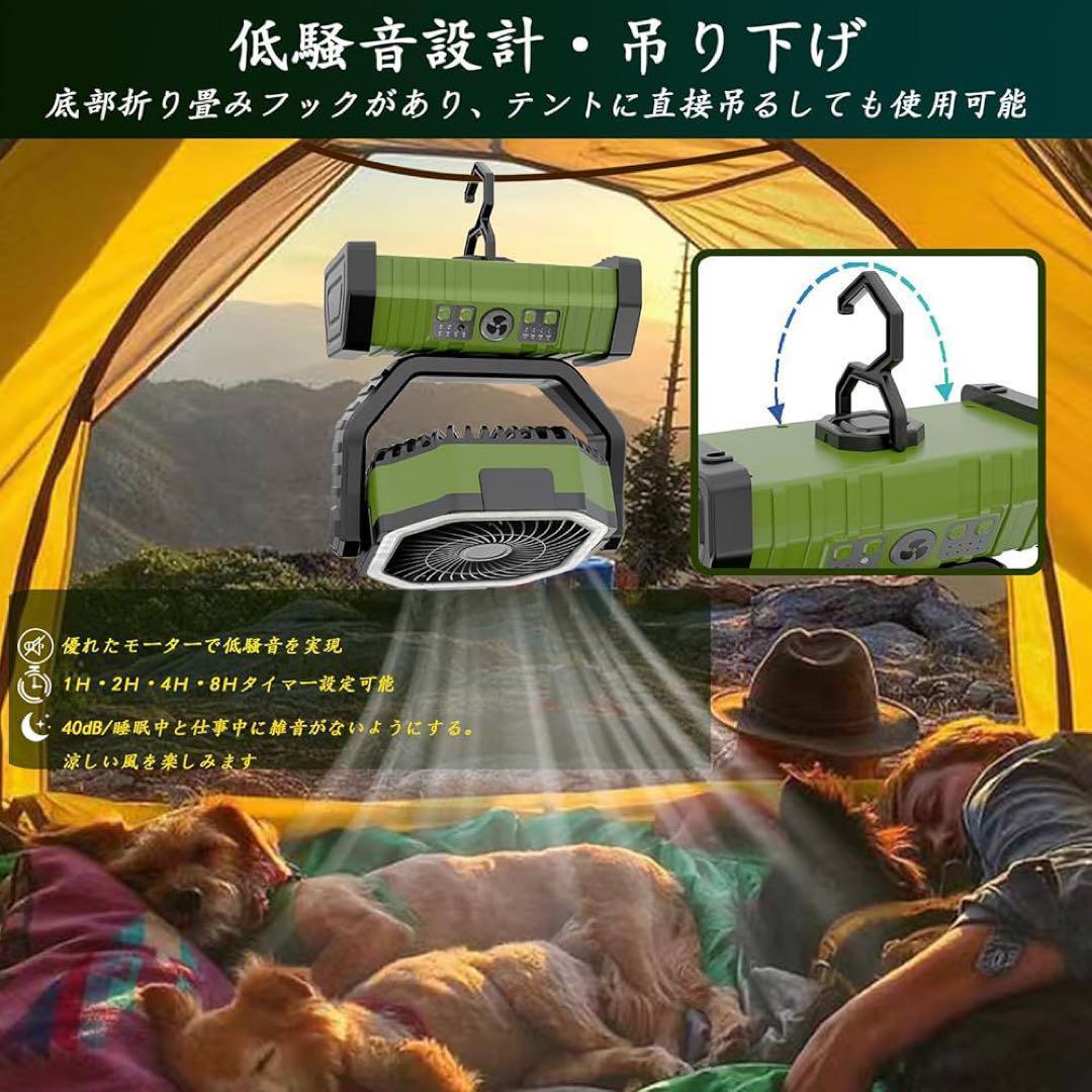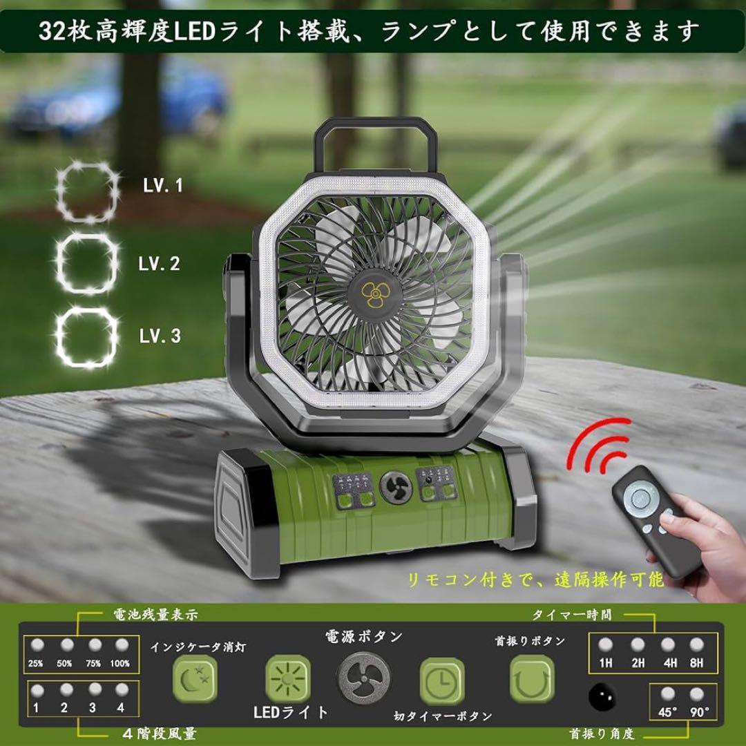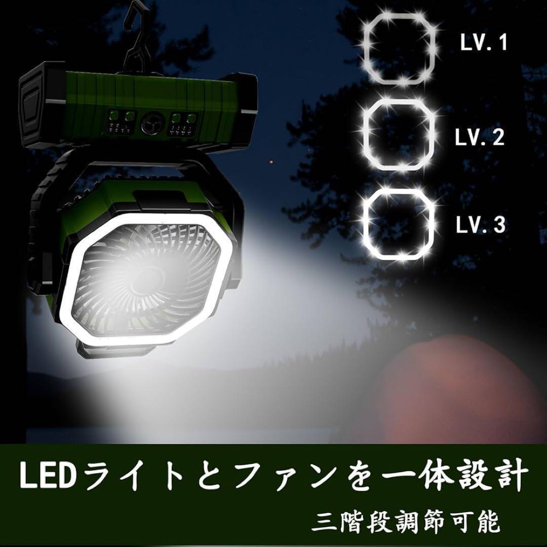 20000mAhの超大容量のリチウムイオンポリマー電池を内蔵され、1回フル充電時で、最小モードで58時間連続使用が可能です。最大モードでも約15時間の連続使用が可能です。4段階風量調節可能、微風、弱風、中風、強風4つのモードがあり、お好みの風でリラックスできます。キャンプ扇風機は高輝度LEDライトも搭載し、低輝度で最大約138時間の点灯が可能です。ライトの輝度を3段階調節することができます。風量も輝度もお好みに合わせて調整できます。