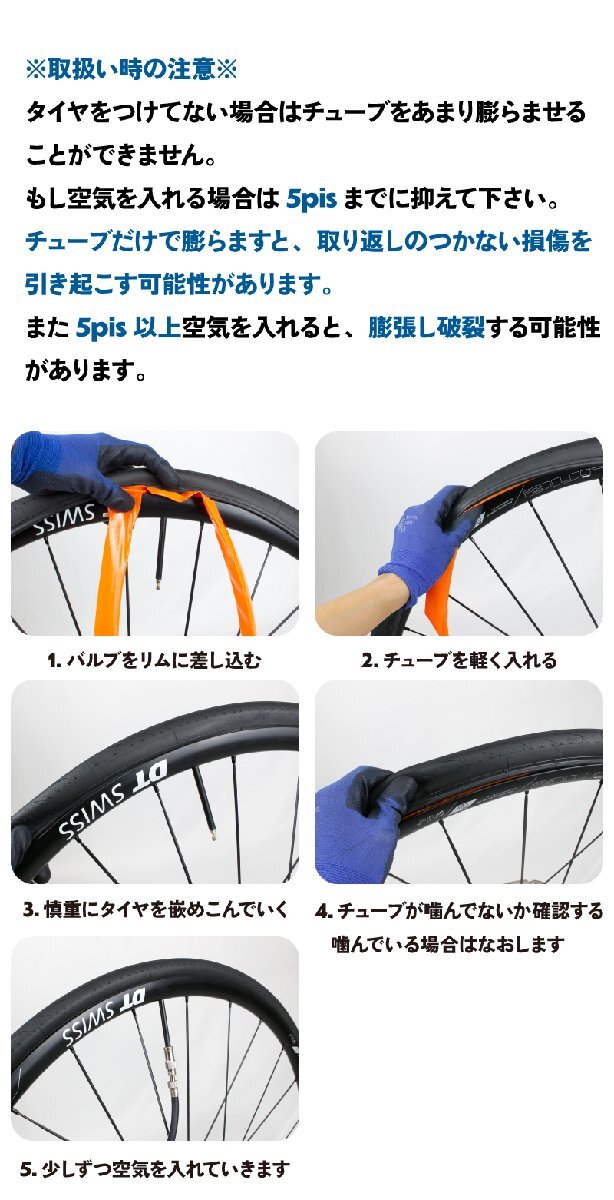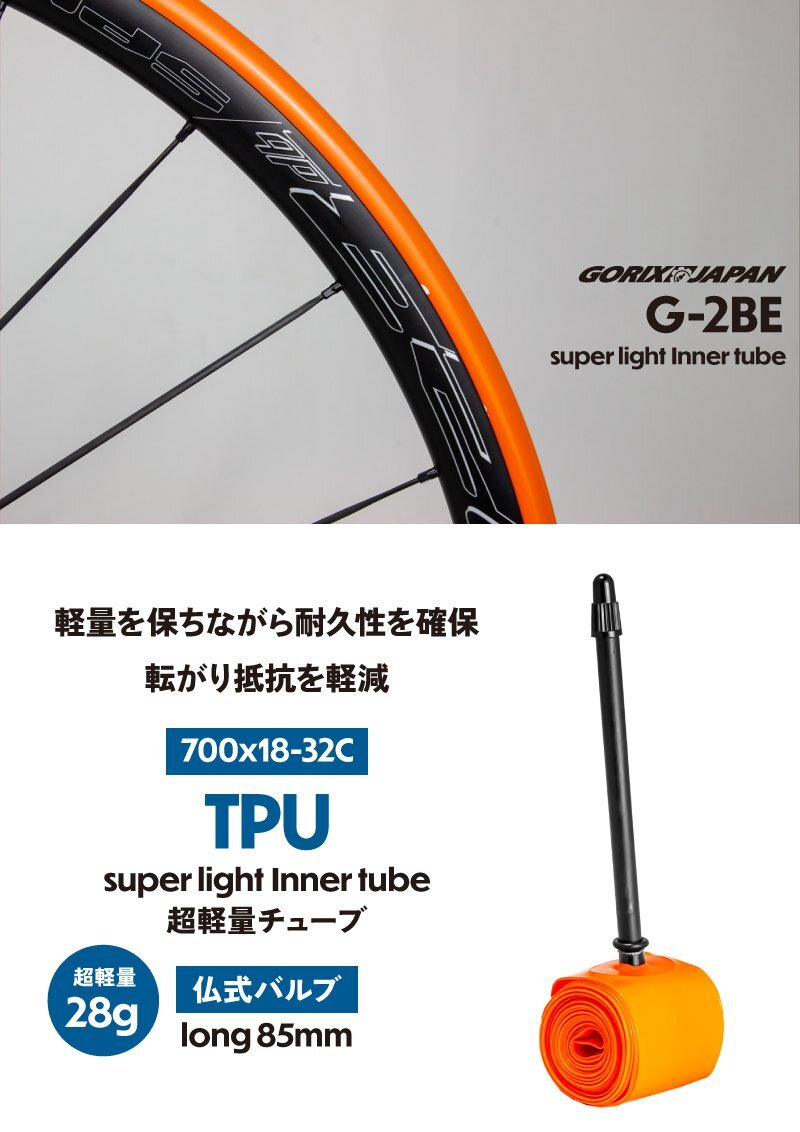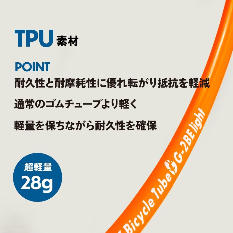 強度が高く軽量なのが特徴のTPUインナーチューブ。 またゴムのように弾力性があり、耐パンク性能が高い。 28gと超軽量で転がり抵抗が低い。優れたチューブとなっています。 ロードバイク、クロスバイクやグラベルなどの700Cタイヤ対応のチューブ。18cから32cまでカバーします。 フレンチバルブ(仏式)でバルブ長85mmロングバルブとなっています。 エアロホイールなどのディープリムのホイールにも最適です。 [転がり抵抗が低い] [装着方法] ペラペラのTPUチューブを嵌めやすくするため初めに空気を入れる場合は5pisまでに抑えて下さい。 入れすぎると損傷しますのでご注意下さい。 チューブだけで膨らますと、取り返しのつかない損傷を引き起こす可能性があります。 1.バルブをリムに差し込む 2.チューブを軽く入れる 3.バルブ付近から慎重にタイヤを嵌めこんでいく 4.チューブが噛んでいないか確認する 5.少しずつ空気を入れていきます ※お気を付けください※ タイヤをつけてない場合はチューブをあまり膨らませることができません。 チューブだけで膨らますと、取り返しのつかない損傷を引き起こす可能性があります。 また5pis以上空気を入れると、修復不可能な膨張が発生します。 商品内容自転車用TPUチューブ、Oリング 素材TPU(熱可塑性ポリウレタンエラストマー) 重量28g 適用サイズ700x18-32C (700x18c 23c 25c 28c 30c 32c) バルブ仕様仏式85mm |