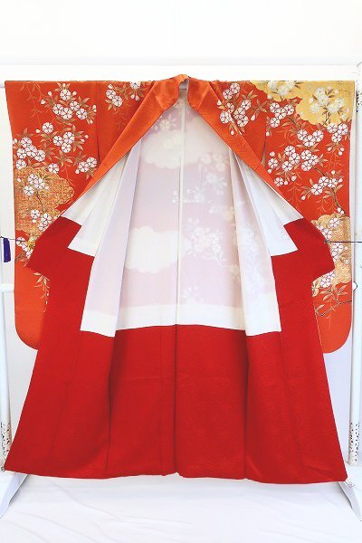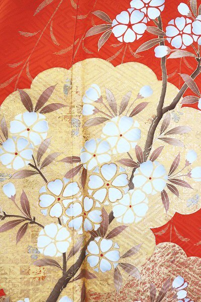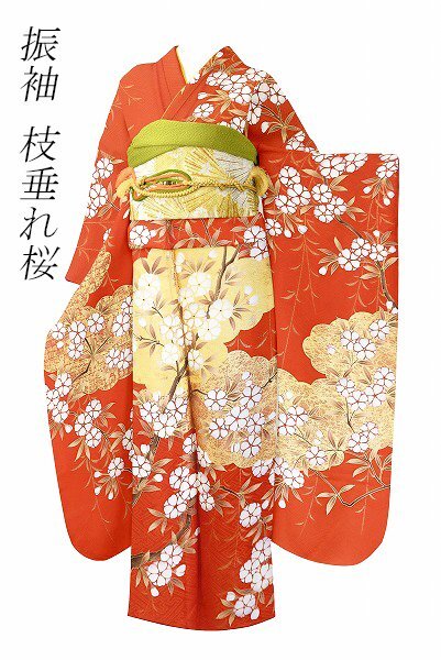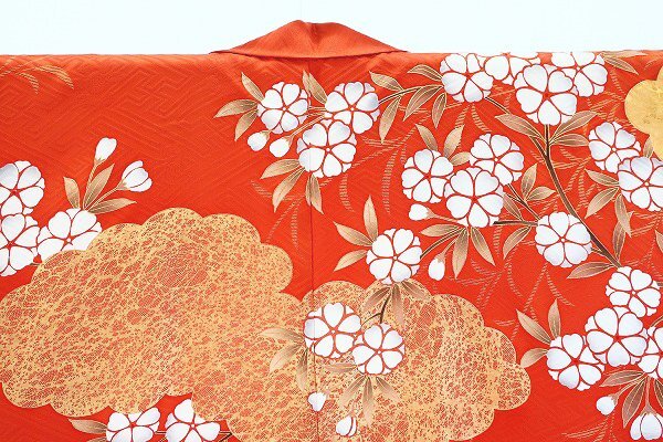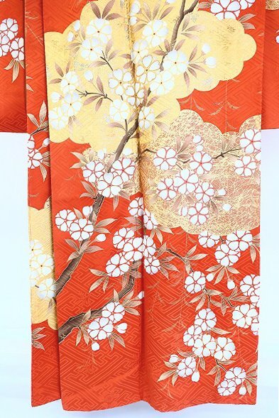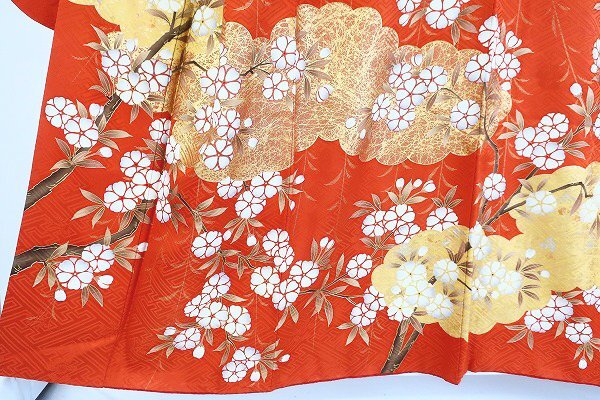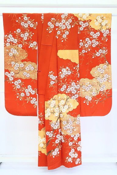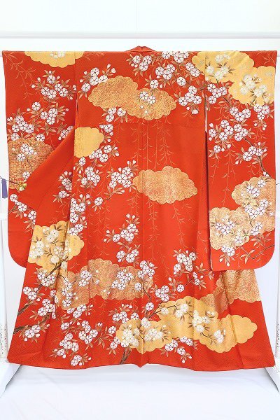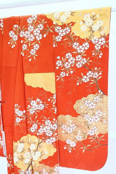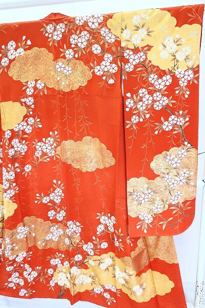 | 【送料無料】美品 振袖 朱色 雲取り 枝垂れ桜 金彩加工 身丈155cm フォーマル 成人式 結婚式 正絹 仕立上がり 着物フィ m-8140 |