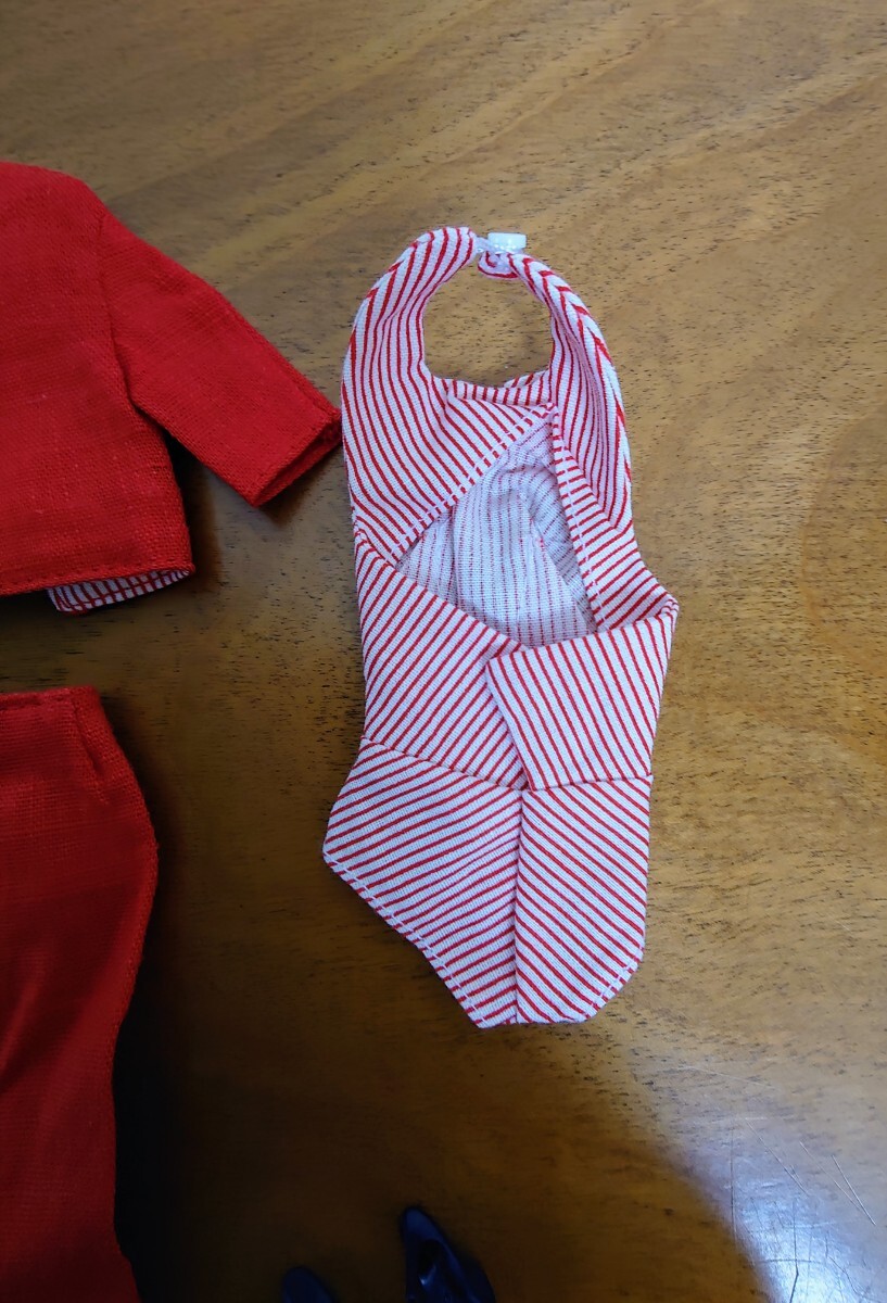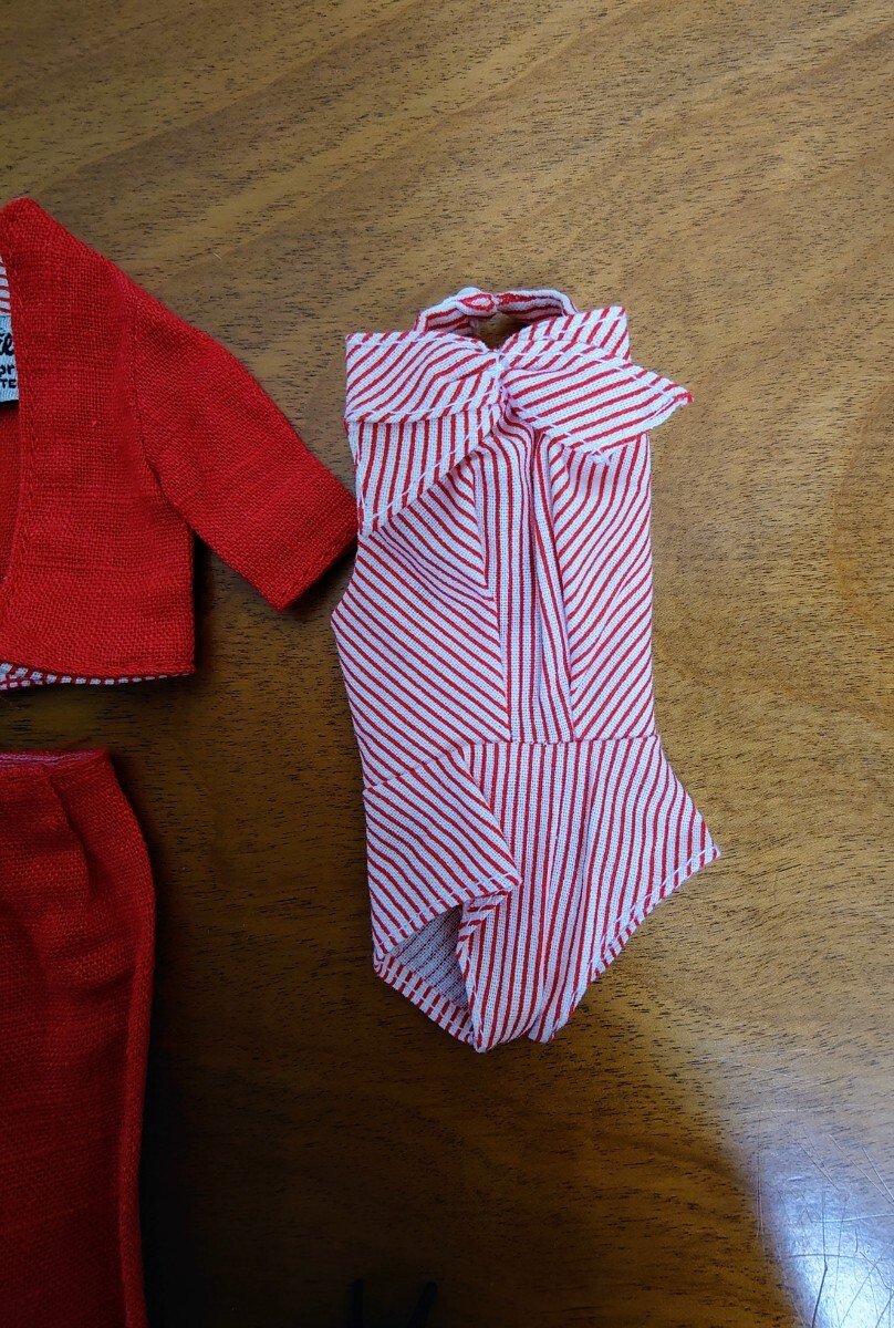 レッドジャケット、ホルターネックストライプシャツ(ボディスーツになってます)、レッドスカート、ネイビーミュールサンダル