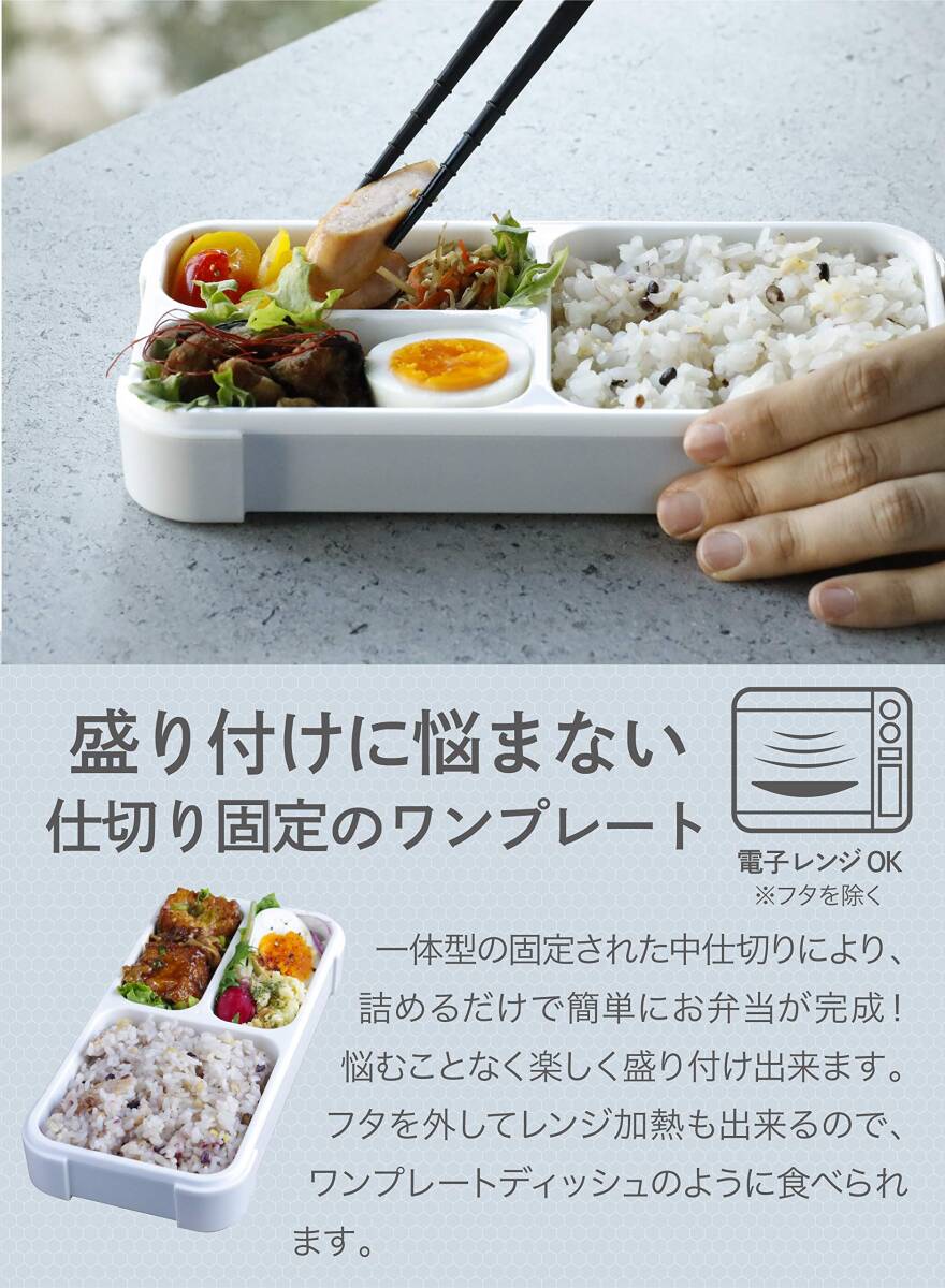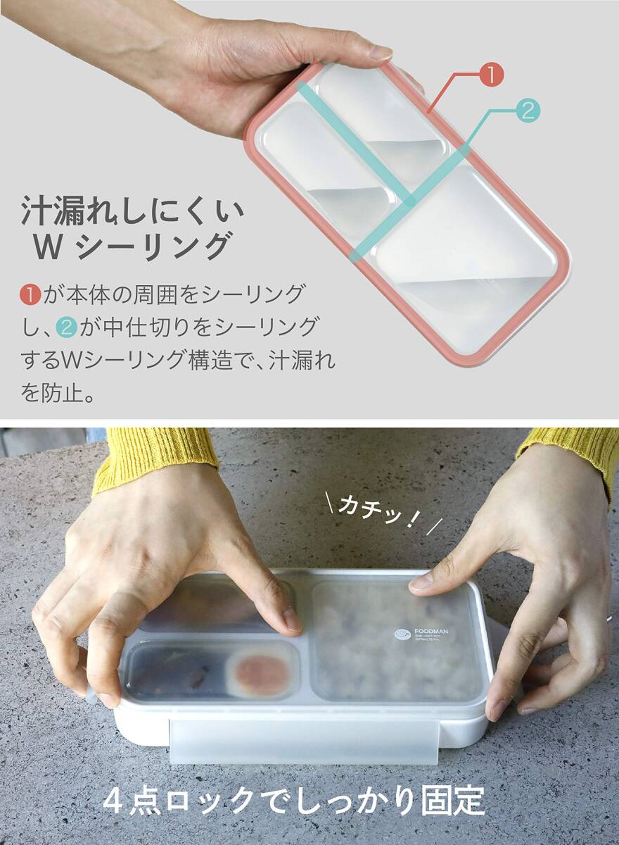 ・【汁漏れしにくい】一体型のパッキンと4点ロックで汁漏れを防止します! 本体の周囲と中仕切りをシーリングするWシーリング構造で、汁漏れを防止します。各スペースの汁移りも防ぐので、おかずなどの味移りも防止します。※本商品は密閉容器ではありませんので、水分の多い物や汁物は入れないでください。漏れの原因になります。