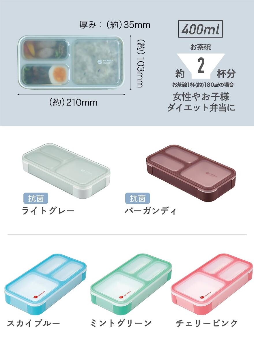 ※この商品は抗菌仕様です。 商品サイズ:約幅21×奥行10.3×高3.5cm 商品重量:約215g 容量:約400ml 主材質:[本体・蓋]ポリプロピレン、[パッキン]SEBS 食器洗浄機OK 電子レンジOK※フタを外して使用してください