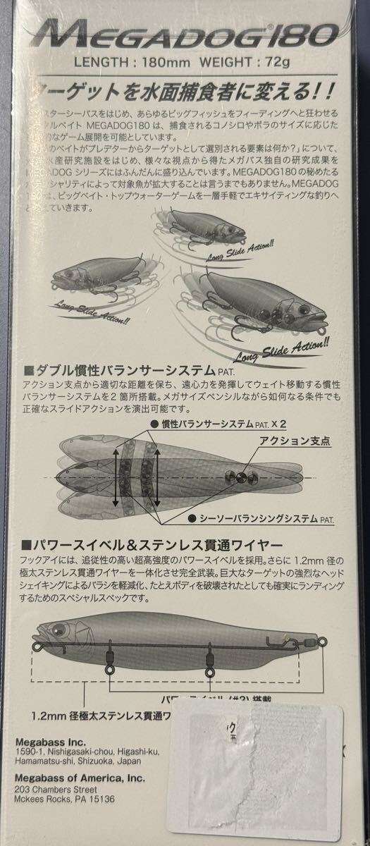 モンスターシーバスをはじめ、あらゆるビッグフィッシュをフィーディングへと狂わせるミラクルベイトMEGADOG180は、捕食されるコノシロやボラのサイズに応じた戦略的なゲーム展開を可能としています。「表層のベイトがプレデターからターゲットとして選別される要素は何か?」について、海洋水産研究施設をはじめ、様々な視点から得たメガバス独自の研究成果をMEGADOGシリーズにはふんだんに盛り込んでいます。MEGADOG180の秘めたるポテンシャリティによって対象魚が拡大することは言うまでもありません。MEGADOG180 は、ビッグベイト・トップウォーターゲームを一層手軽でエキサイティングな釣りへと変えていきます。