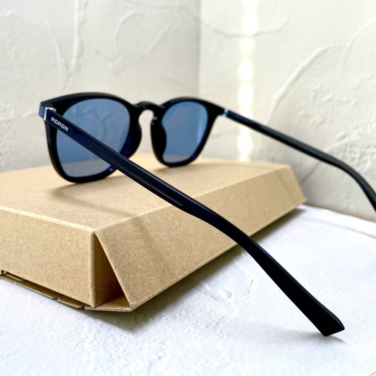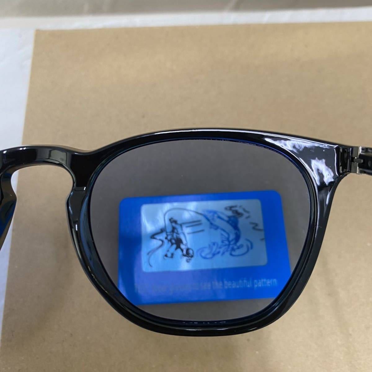 フレームはブラックで、レンズはブルーのスモークになります。サイドのテンプルはアルミマグネシウムで軽量です。テンプルのヒンジははスプリングヒンジなので、フィット感も抜群!