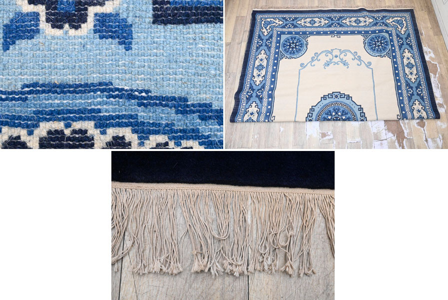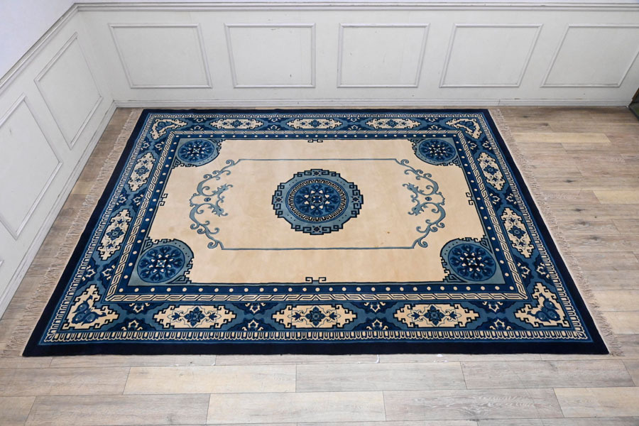 ----------------------------------------------------------------------------------------- ●送料や注意事項は必ずご確認下さい。落札後にトラブルになるケースが増えております。● ◆コンディションは写真・文章にて記載して有りますが、全てのキズの写真は掲載致しておりません。大きなダメージを除き見落とし、記載漏れが有る事はご了承下さい。 ◆当サイトにて出品する商品は多種多彩で、当方商品知識の無い物も多数ありますので落札後の質問やメンテナンス等にはお答えできません。 ◆入札された時点で、画像、文章をご理解していただいたものと判断させていただきます。不明な点は前もってQ&Aからお願い致します。入札後の質問やお電話等でのキャンセルは一切受け付け致しません。 ◆商品説明に「ノークレーム」と記載しているものに関しては、如何なる状況で届いても保証致しません。詳しくは注意事項の「商品到着後について」の最後に記載しておりますのでご確認下さい。 ---------------------------------------------------------------------------------------- 鮮やかな青にウールの良質な色彩が、見る者を魅了するお品に仕上げています。 中古品ですのでキズ、薄汚れ、シミ、裏面ヨゴレ等有りますが、程度は良いでしょう。 当方でクリーニング等はしておりません。 和室から、洋室までお使いいただけるお品です。 幅351×245cm(房含む) 厚1cm | ||