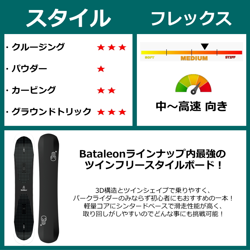 Bataleonで最も人気のあるボードのグレードアップバージョン。より軽量のコア、高速ベースなどのアップグレードされたマテリアルの使用により、今回のラインナップ中で最強のツインフリースタイルボードです。今シーズンのEvil Twin Plusは、ニューシェイプになり、素晴らしい仕上がりになりました。