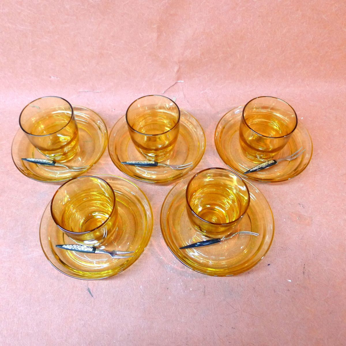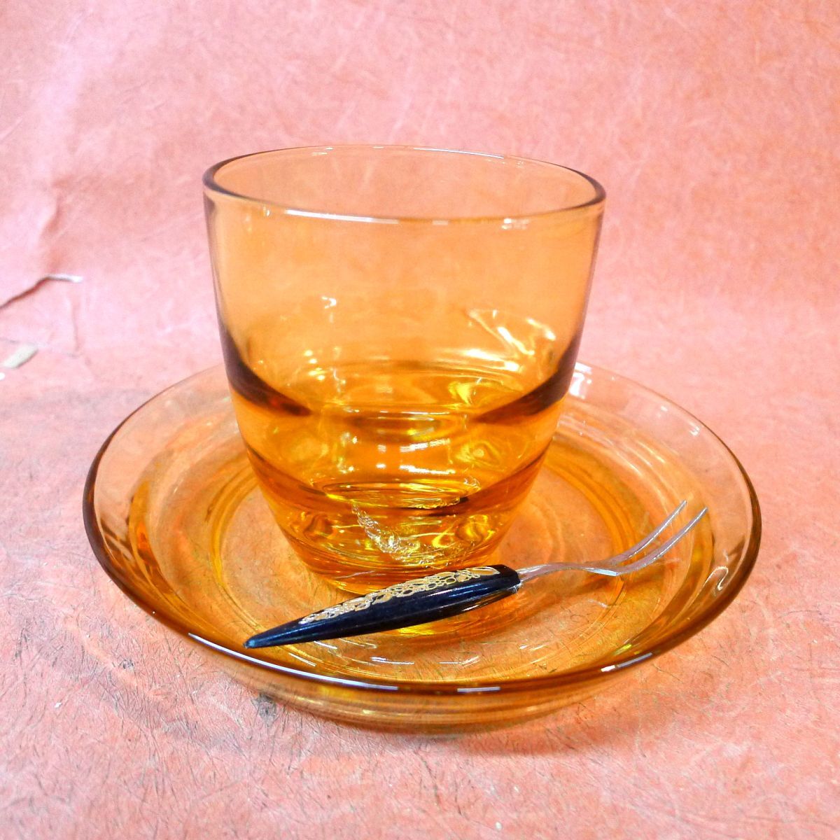 商品名・アンバー ガラス製品 コップ 皿 フォーク 5客 アンティーク 昭和レトロ