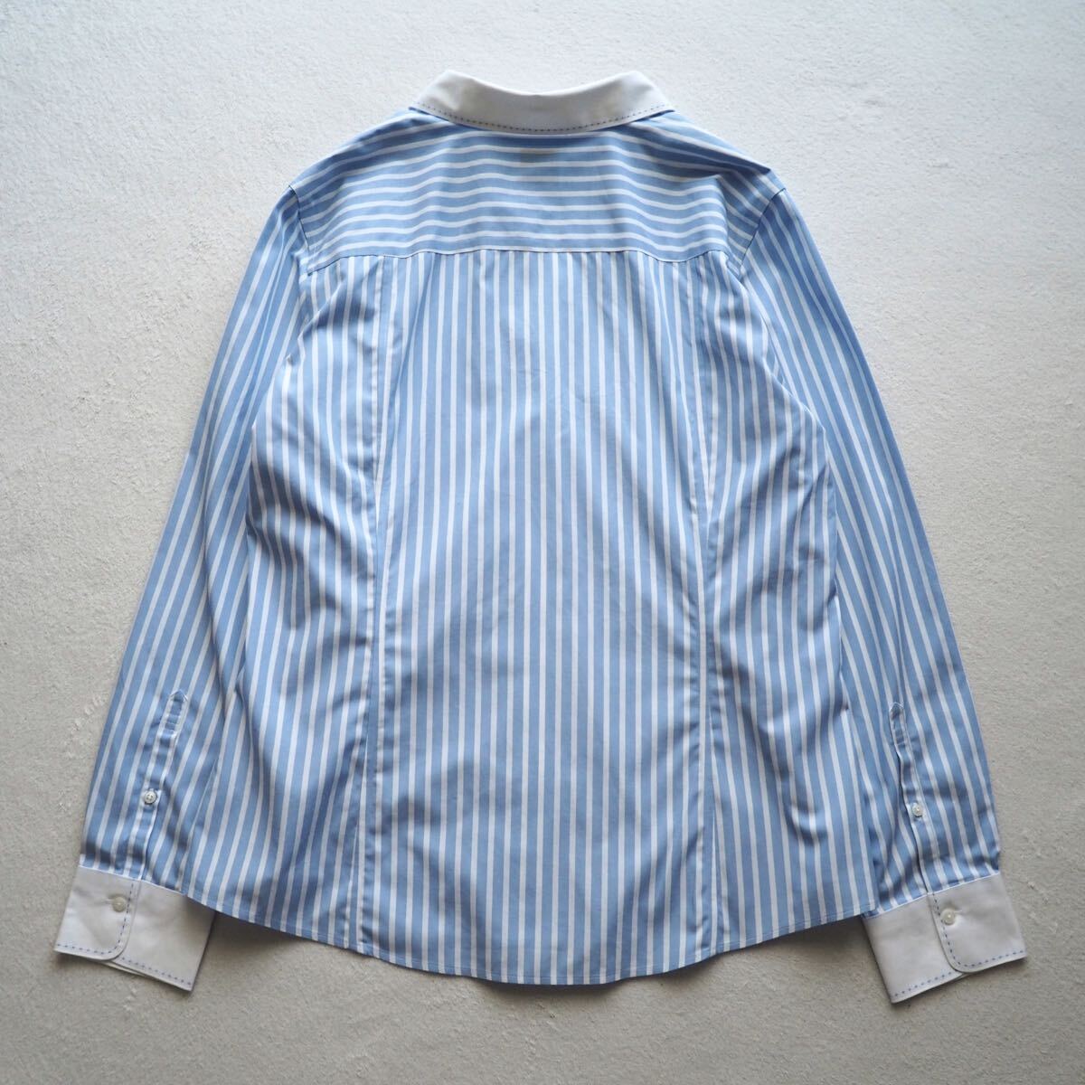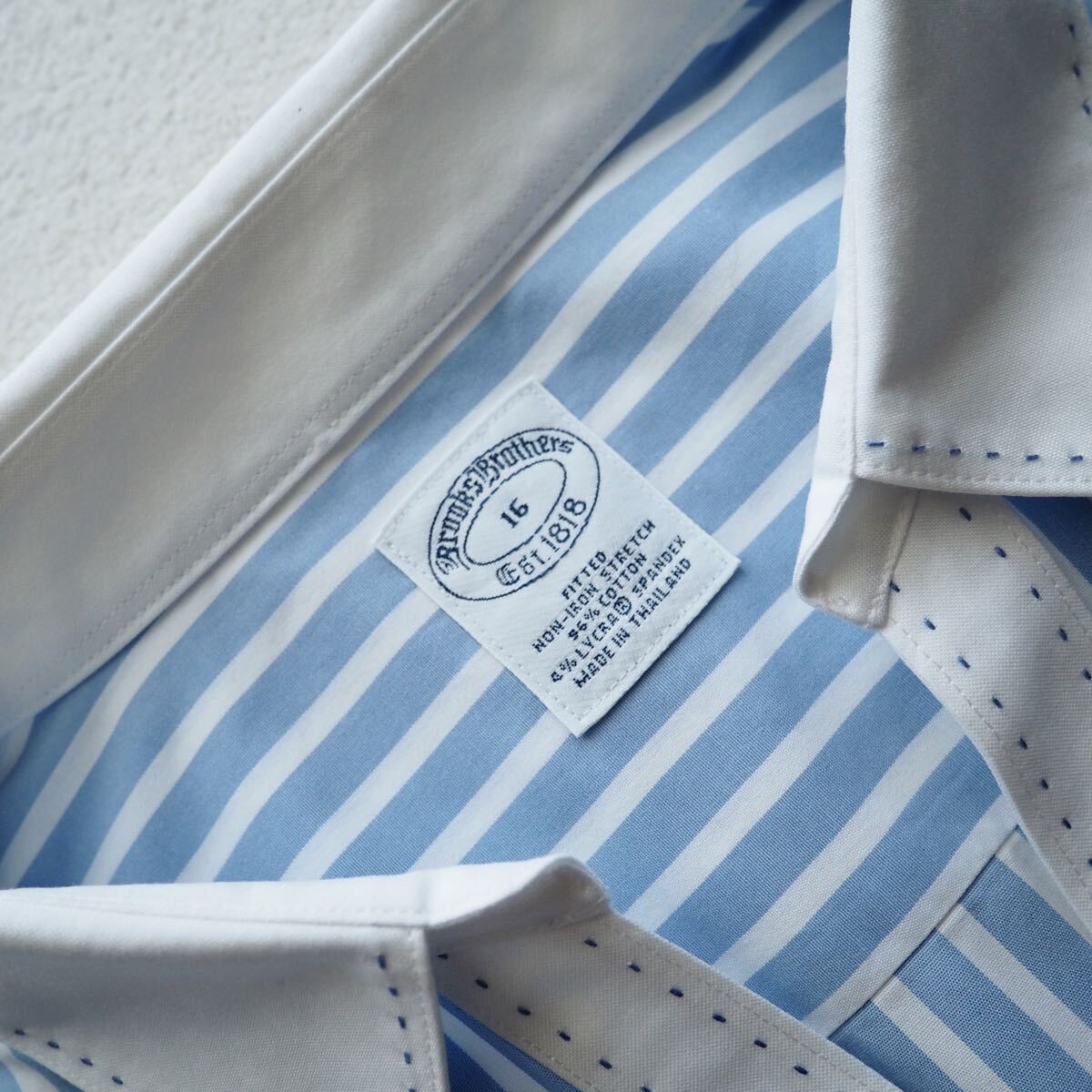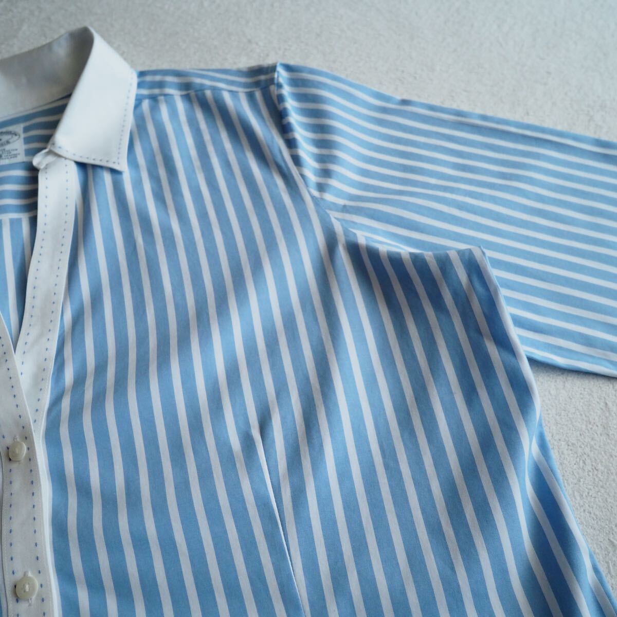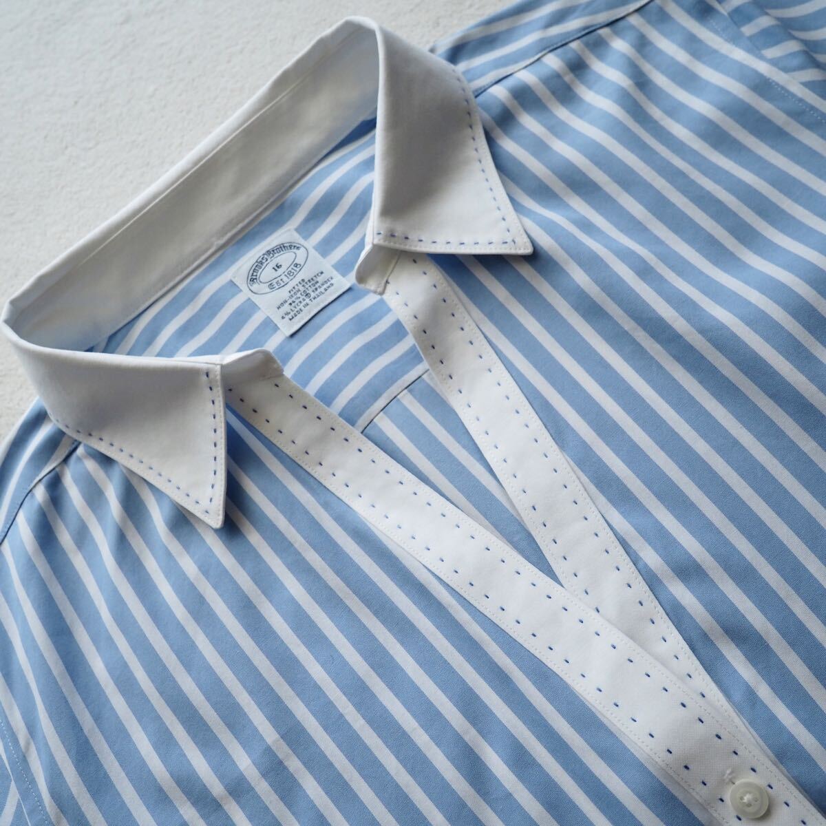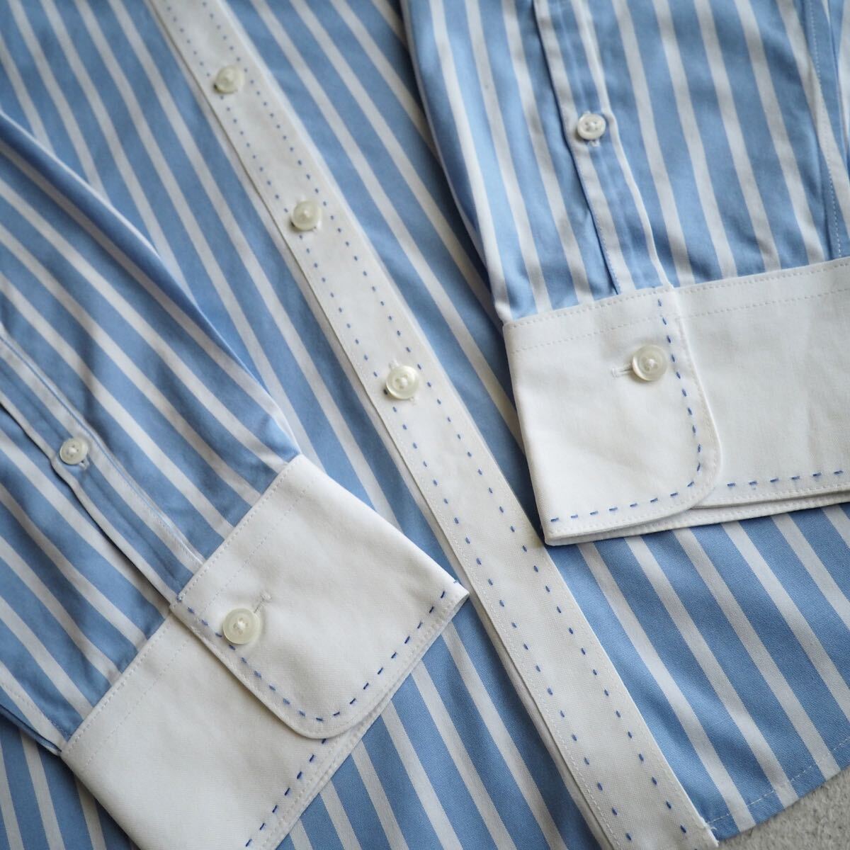 襟や袖口がホワイトになったクレリックシャツで、ブルーのステッチがポイントになっています。