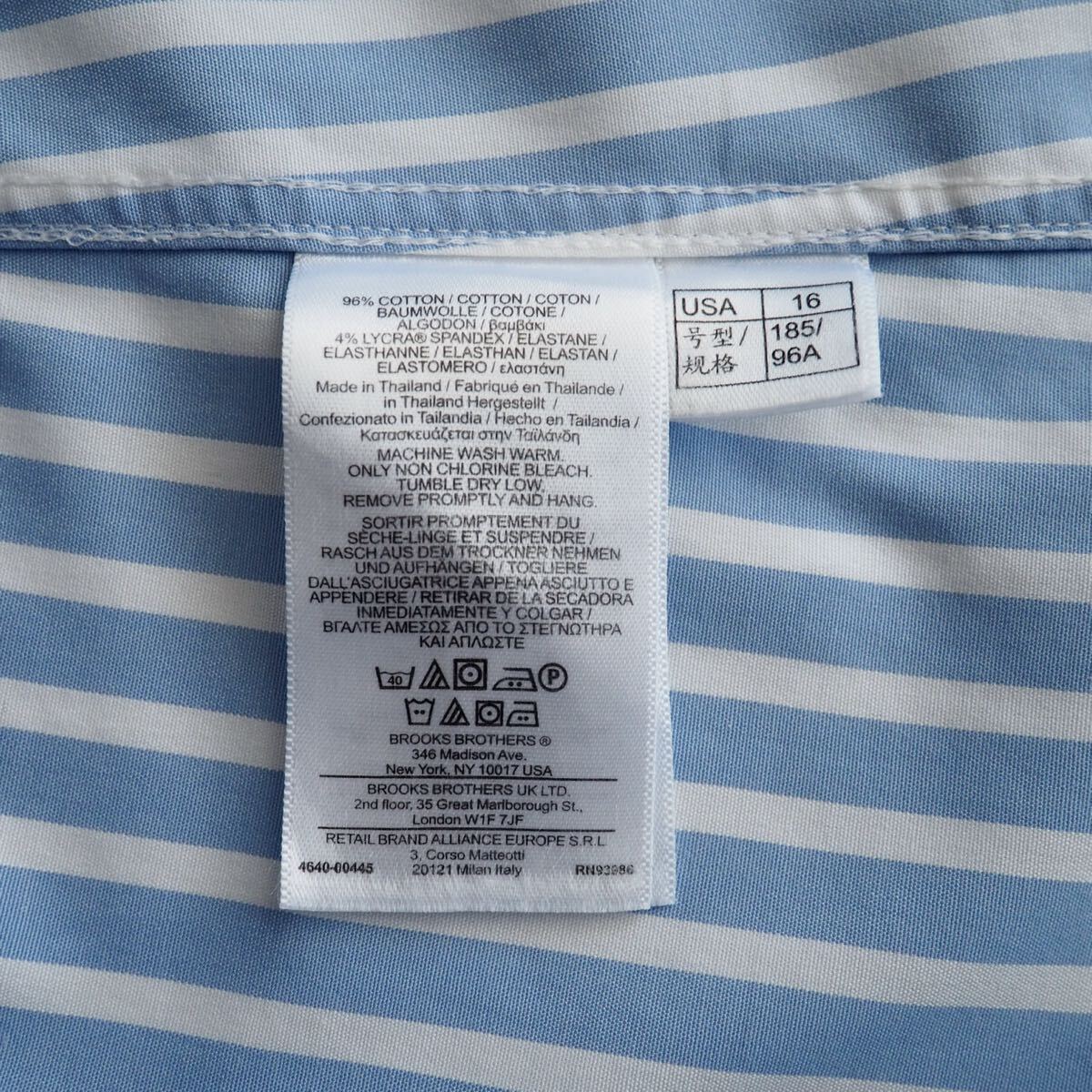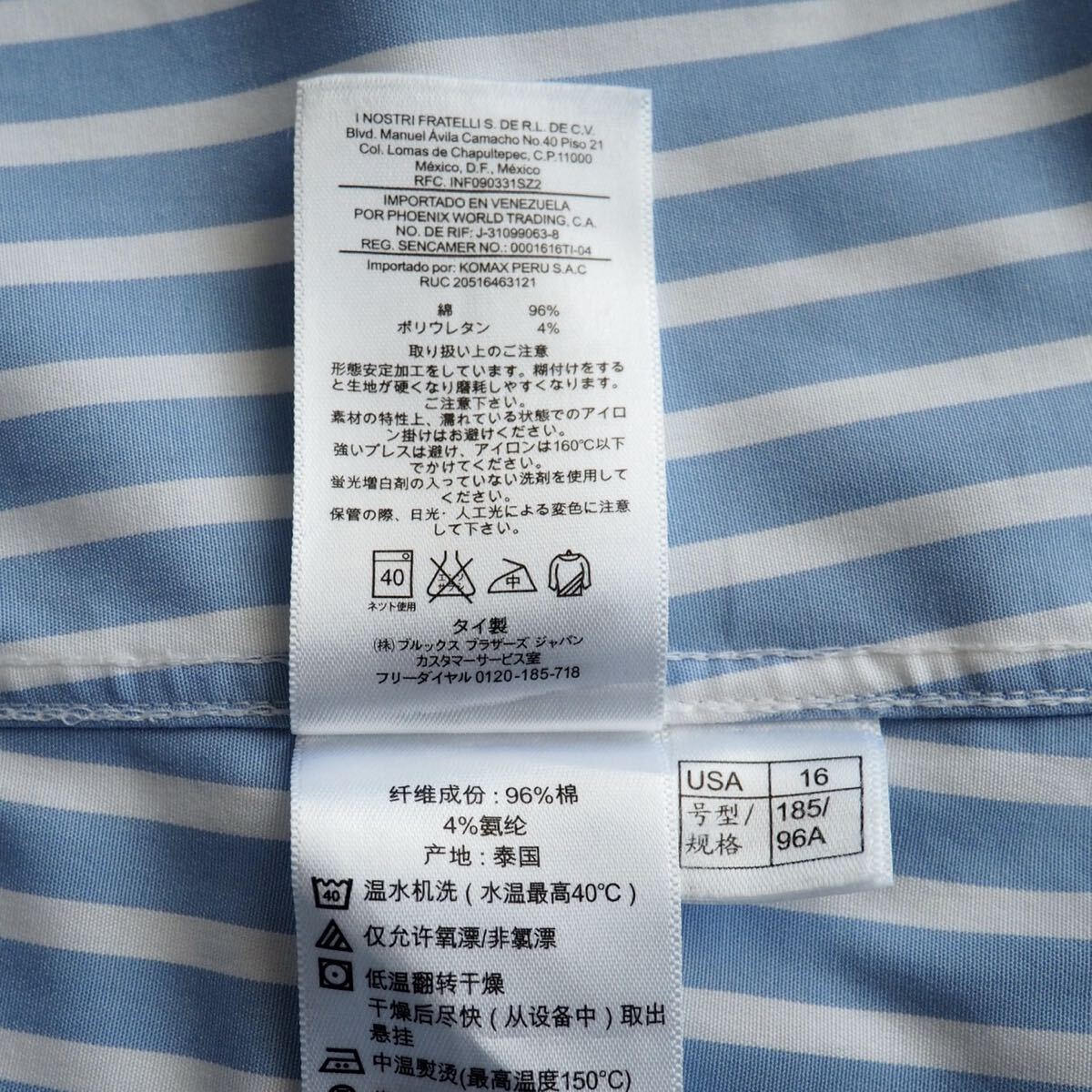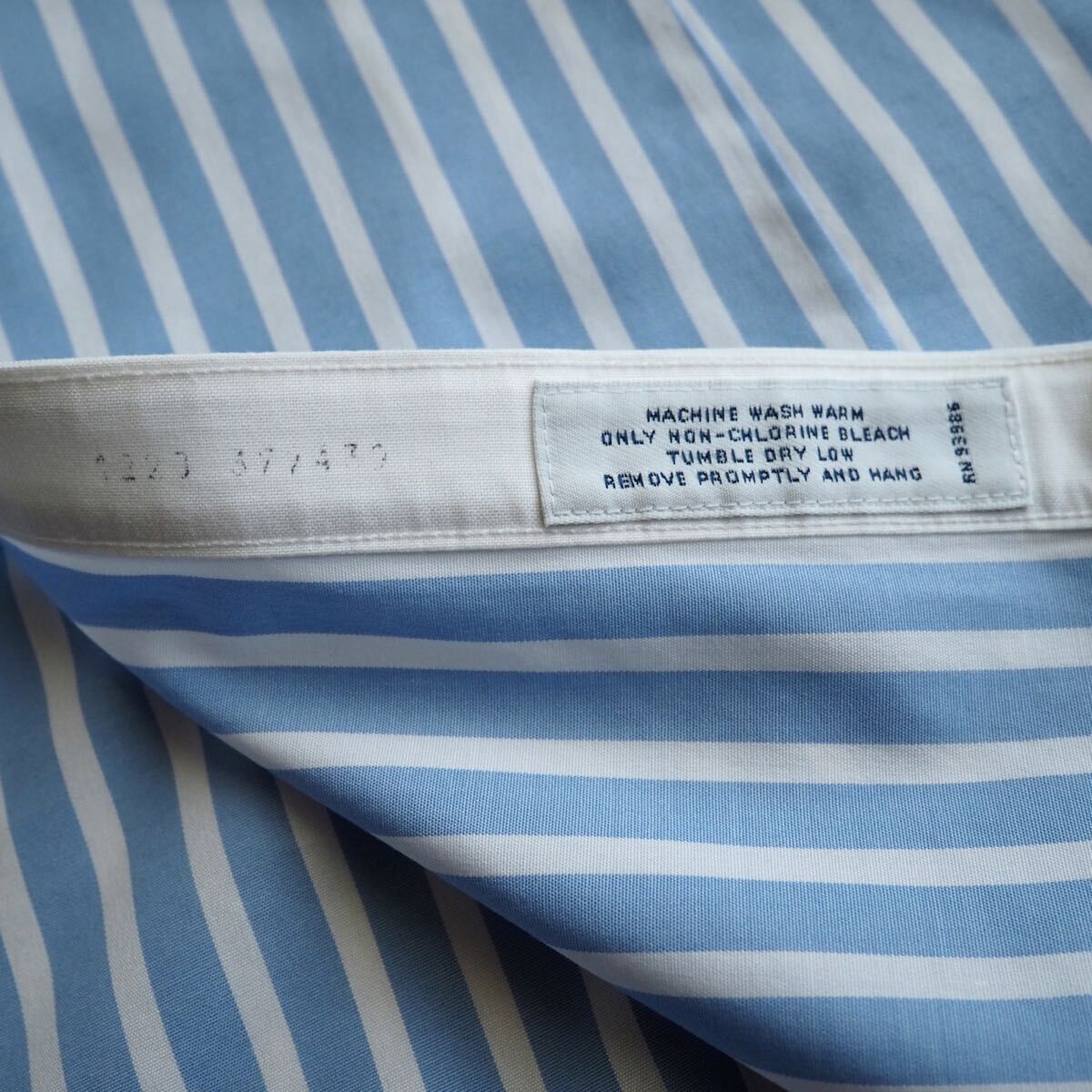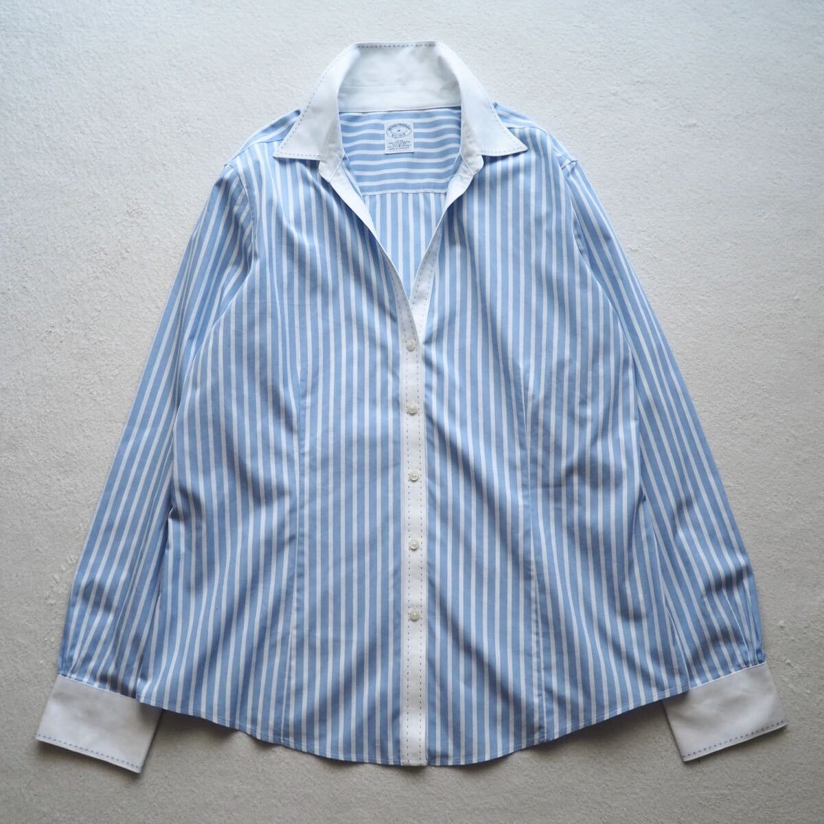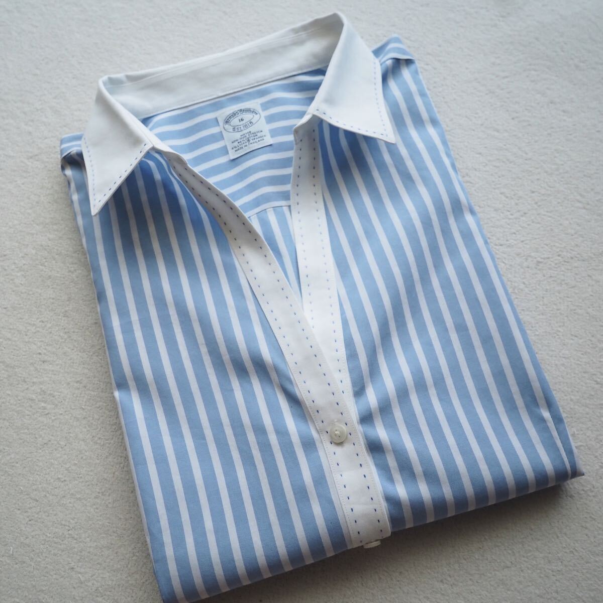 襟や袖口がホワイトになったクレリックシャツで、ブルーのステッチがポイントになっています。