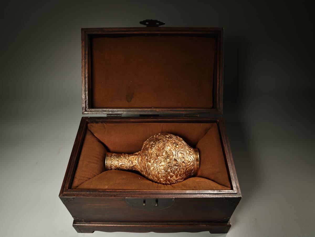 品旧蔵* 清 乾隆年製 純銅 高浮彫鏨刻 塗真金盤龍花瓶 配老漆器盒 銅製 銅器 極細工 唐物 中国古玩 骨董品 古美味 H48