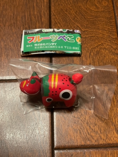 バンダイから出ました「フルーツべこ ならぶんです」全5種から「いちご」になります。300円ガチャにしては重量感・厚みのある造形で、長さ約5.5センチ、高さ約3センチです。内袋未開封、リスト付きです。