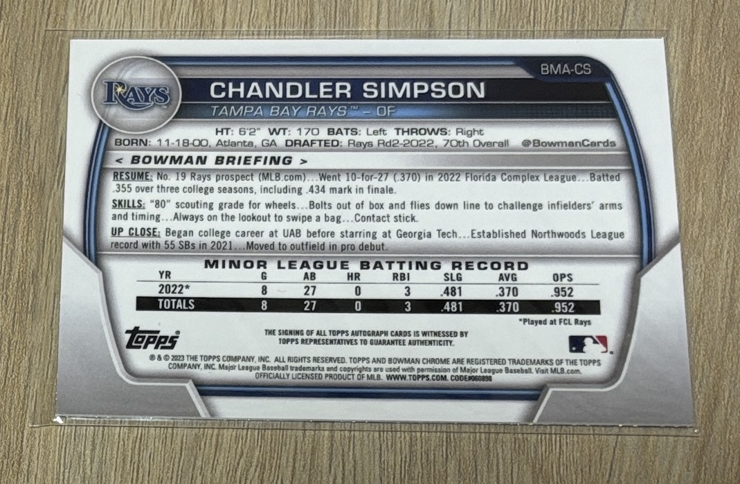 Chandler Simpson(チャンドラー・シンプソン)_Auto(直筆サイン入り)_BowmanChrome_Topps_MLBカード