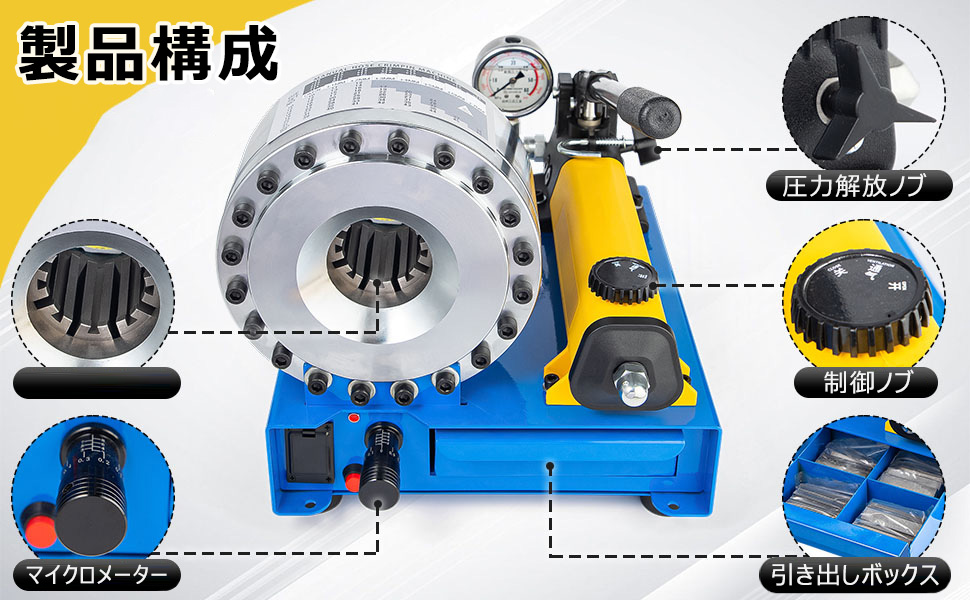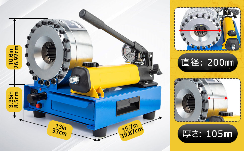 【幅広い用途】油圧チューブ圧着機は、低圧オイルパイプ、エアパイプ、水道管、ケーブルジョイント、自動車エアコンホース、自動車パワーステアリングホースなど、さまざまなゴムホースや編組ホースの圧着に適しています。車両、建設機械、油圧機械、溶接・切断装置などの業界で幅広く使用できます。