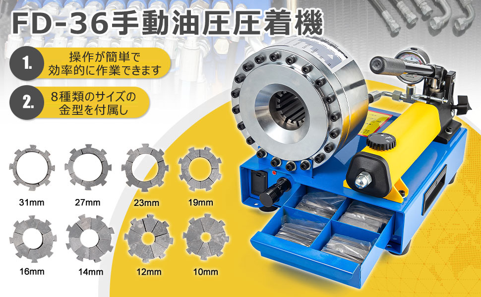 【複数のサイズ】油圧ホース圧着工具、8つのダイスを装備。モールドサイズ範囲:10/12/14/16/19/23/27/30mm、最大開口部(モールドなし):(48mm)。100R7~100R2のデュアルコアホースに適合します。精密圧着:油圧ホース圧着機は、1/4 インチから 1 インチの 1&2 ライン
