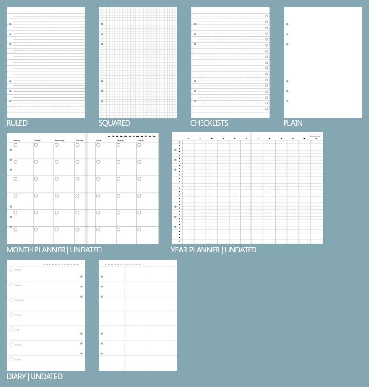 ■ リフィル付き:罫線ノート、無地、方眼ノート、日付無しダイアリー(年間月間週間)、TO DO(チェックリスト) など