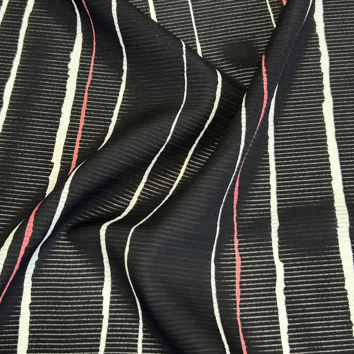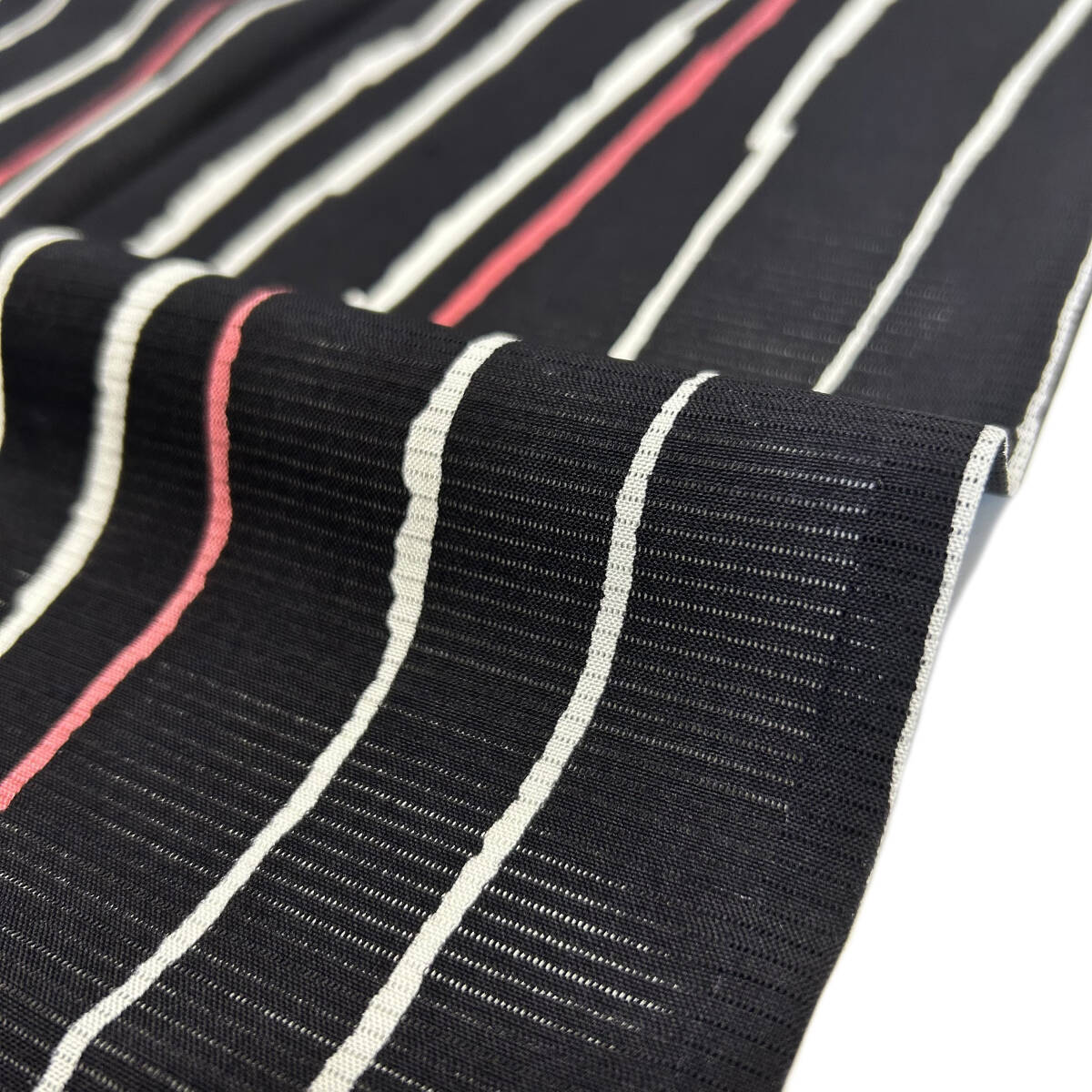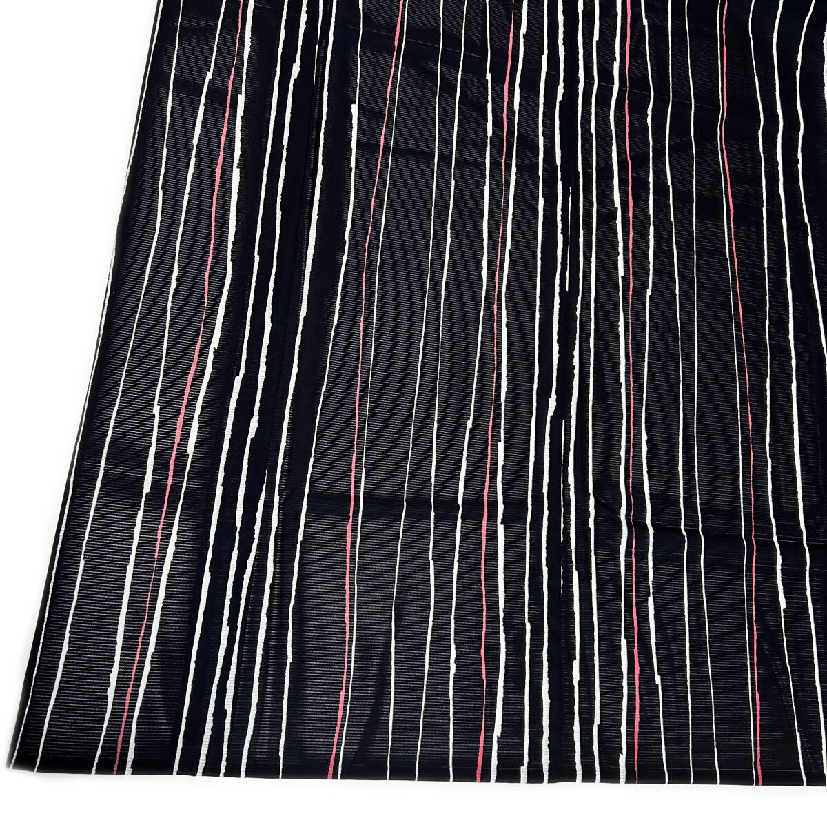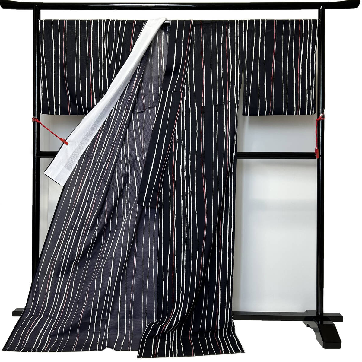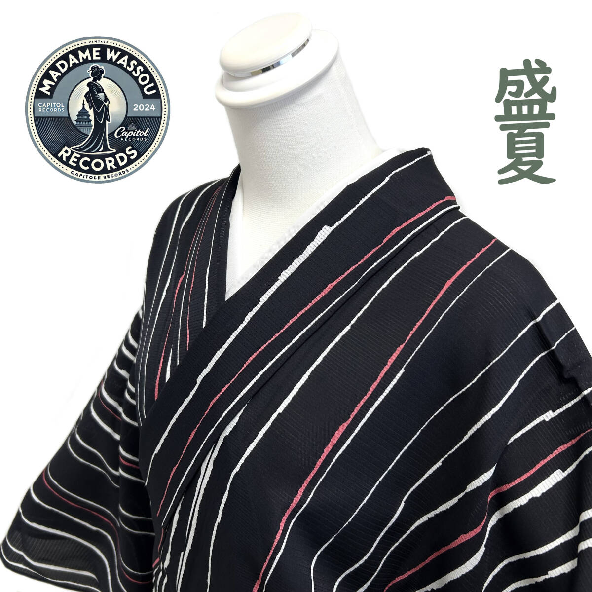 人気のブラックの上質な絽の地に、かわり縦縞が描かれた、これからの季節にお召し頂ける単衣のお着物です。