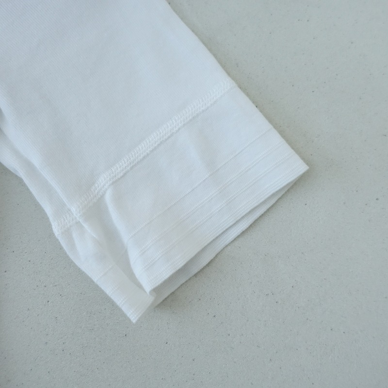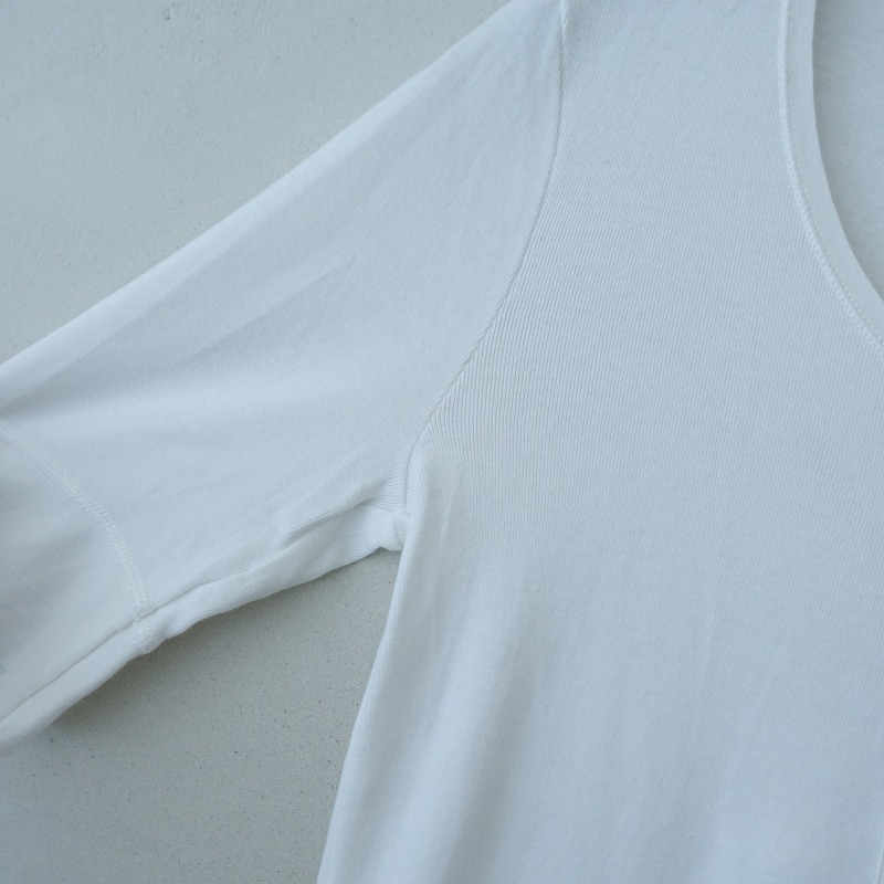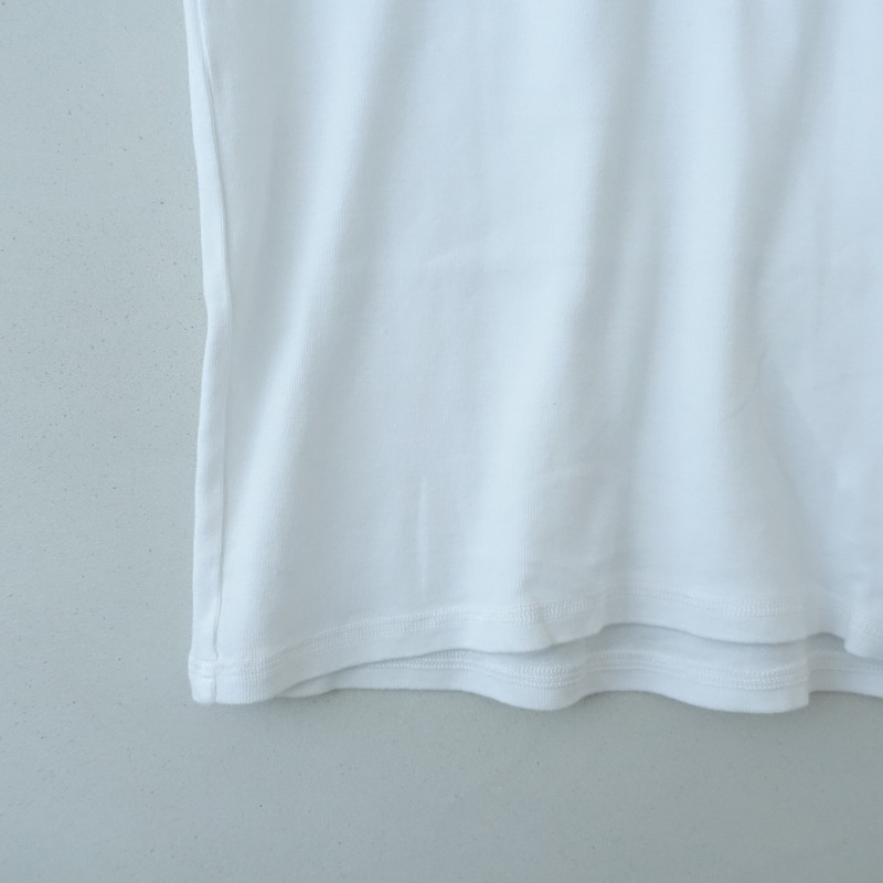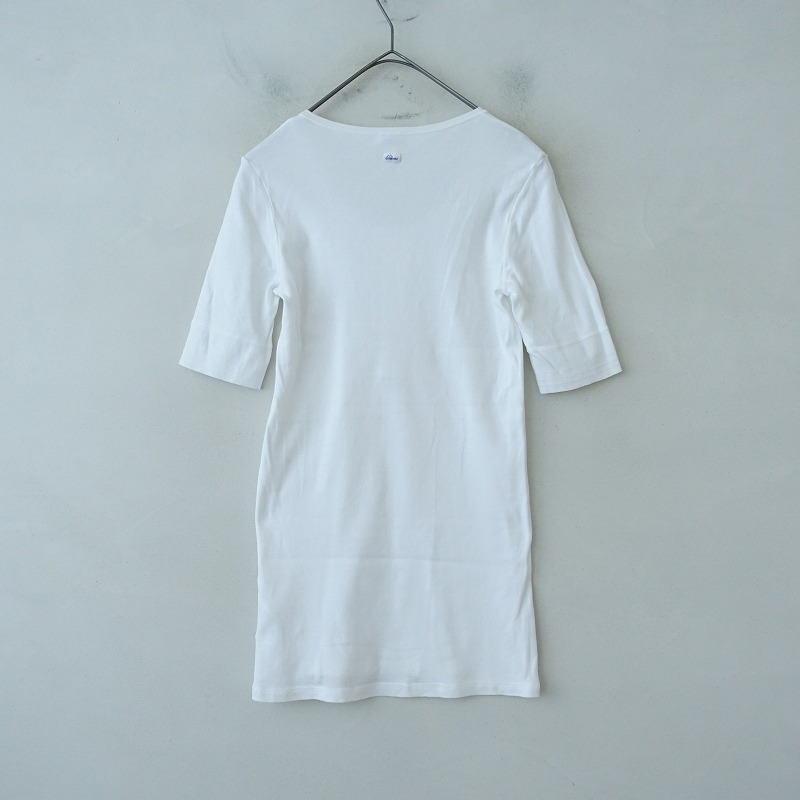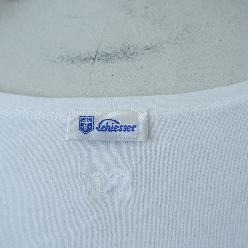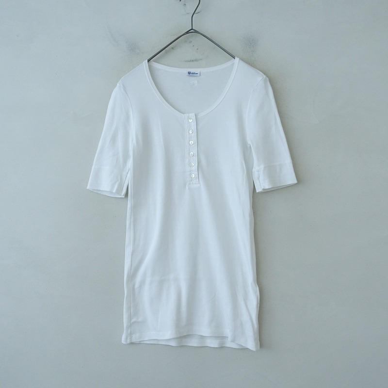 Schiesserのリブ編みヘンリーネックカットソーです。カラーはホワイトで、薄手のリブニット地です。ラウンドネックデザインで、フロント半開ボタン付きのプルオーバータイプで着脱できます。前立て部分は布帛地に切り替えられており、袖口はライン入りのリブ仕様で、バックネックにブランドネームタグ付きです。 |