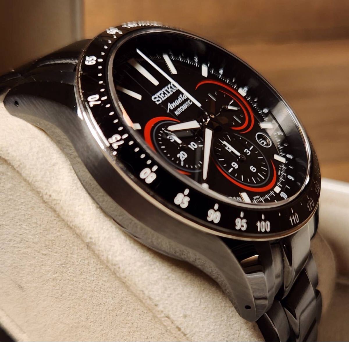 SAEK019は、漆黒の漆塗りのダイヤルと、その上に描かれたサブダイヤルの赤漆のアウトラインが最大の特徴。