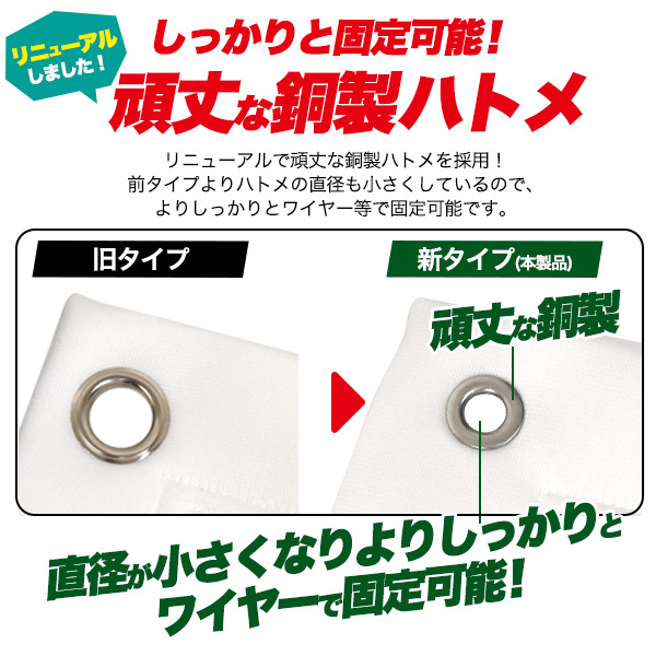 4辺にハトメ処理済み!ワイヤーなどでしっかりと固定できます。