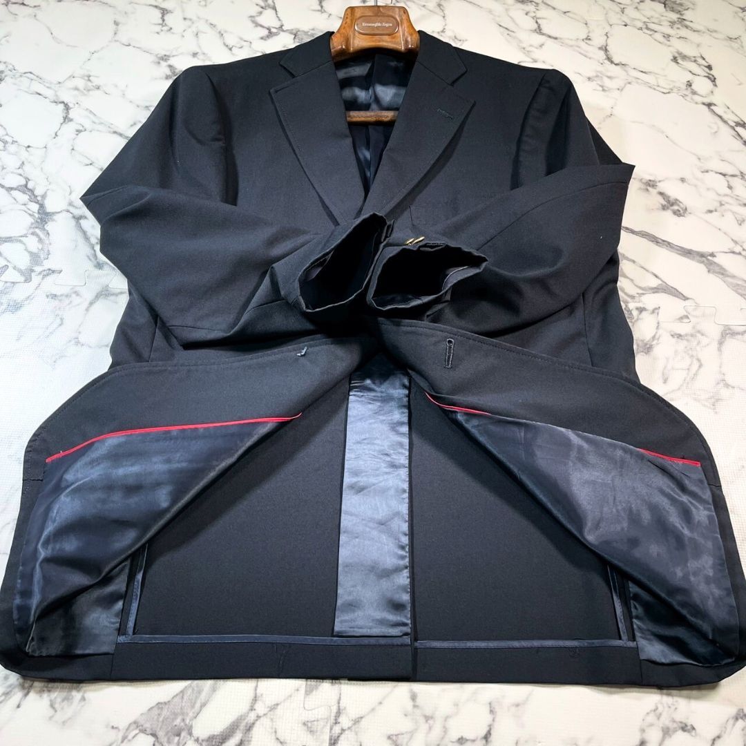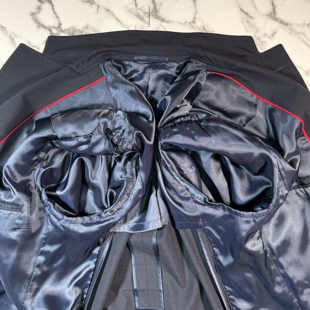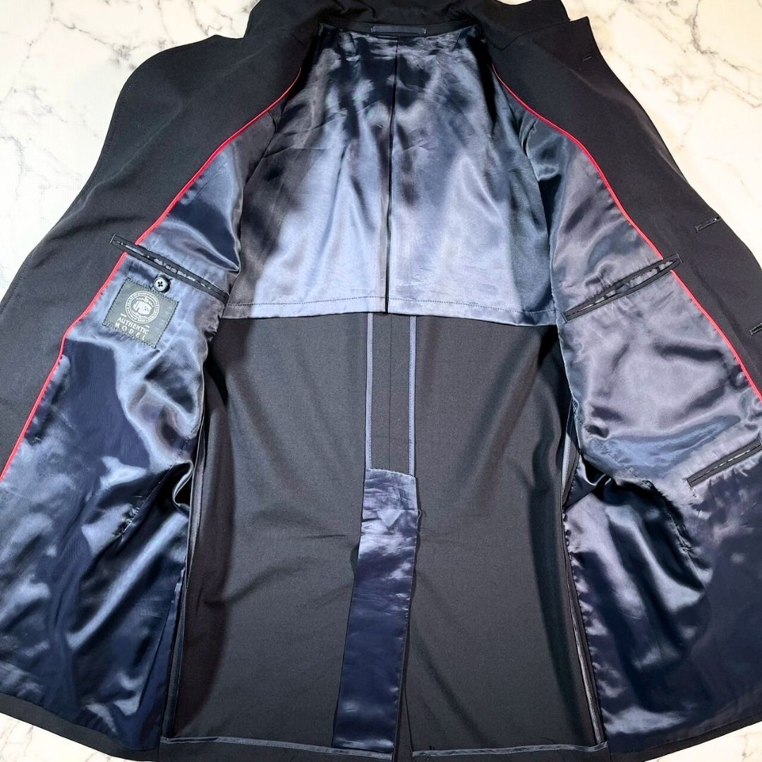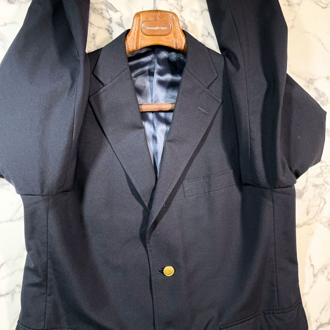 J.PRESS(ジェイプレス)ブラックブレザー、サイズAB6(XL相当)です。シングルブレストの伝統的なテーラードジャケットで、上質なウール(羊毛)素材を使用。ほぼ黒のような紺色落ち着いた色合いに、ブランド刻印入りの金ボタンが上品なアクセントとなり、ビジネスからフォーマルシーンまで幅広く活躍します。背中に1mmの小さな穴が一箇所ありますが、目立たず使用にはほとんど影響のない程度で、全体的に非常に良好なコンディションです。丁寧な仕立てと安定感のあるシルエットで、着心地も快適。ジャケットとしての基本性能をしっかり備えているため、長く愛用いただける一着です。シンプルながらも洗練されたデザインは、ジャケット初心者からこだわり派まで幅広い層におすすめ。通勤やビジネスミーティング、式典などのフォーマルな場面でも安心して着用可能です。季節を問わず着回せる万能アイテムで、クローゼットに一着あると重宝します。サイズ感や素材感、デザインのバランスが整った、J.PRESSの定番ブラックブレザーです。