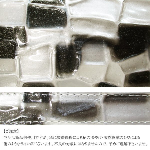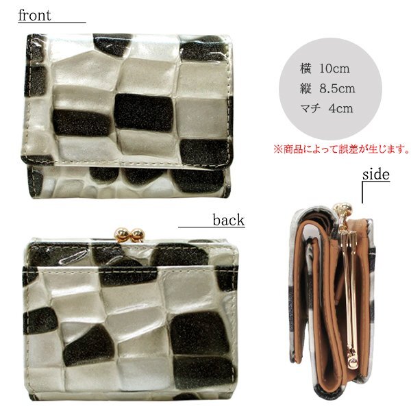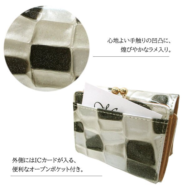 | 心地よい手触りの凹凸に煌びやかなラメが光る、コンパクトなガマ口財布。 表面はエナメル加工で、多少の水滴もサッと拭き取れます。 アピールポイントは広く開くガマ口。 レジ前でも急がずにサッと取り出せます。 お札やカード入れはきつくないように余裕を持たせました。 外側にはICカード等が入るポケットが付いていて便利です。 手のひらサイズなので、トレンドのミニバッグにもスッと入ります。 コンビニやちょっとしたお買い物はポケットIN。 ■カラー:ブラック ■サイズ(約):縦8.5cm×横10cm×マチ4cm (商品によっては誤差が生じます。予めご了承下さい。) ■素材:外側/牛革(クロコ型押しエナメル加工)、内側/ボンテッドレザー ■仕様:スナップボタン開閉、札入れ×1、カードポケット×3、がま口小銭入れ×1、オープンポケット(外側)×1 ■付属:Maturi専用BOX ■新品未使用 ■定価30000円 ※一部共通画像使用 【ご注意】 ※商品によって柄は異なります。柄の指定はできません。 ※新品未使用ですが、稀に製造過程による柄のぼやけ・天然皮革のシワによる傷のようなラインがございます。 細かい傷や汚れについても、不良の対象にはなりませんので、予めご理解下さい。 ※ご覧のモニターやブラウザの設定、照明等により、画像と実物の色合いが若干異なる場合がございます。 これらについては予めご理解頂いた上でご購入下さい。 当店の商品は、全商品「同梱不可」です。 ※1点につき送料がかかります。ご了承頂ける方のみ、オークションへご参加下さいませ。ご参加後のキャンセルはできません。 当店はお客様に喜んで頂けるようお安い価格でオークションへ出品しております。転売目的の入札・落札は固くお断り致します! 万が一、箱なしや外箱(袋)の潰れや破れがある場合、付属品のない場合でも交換や保証は致しません。予めご了承下さいませ。 | |