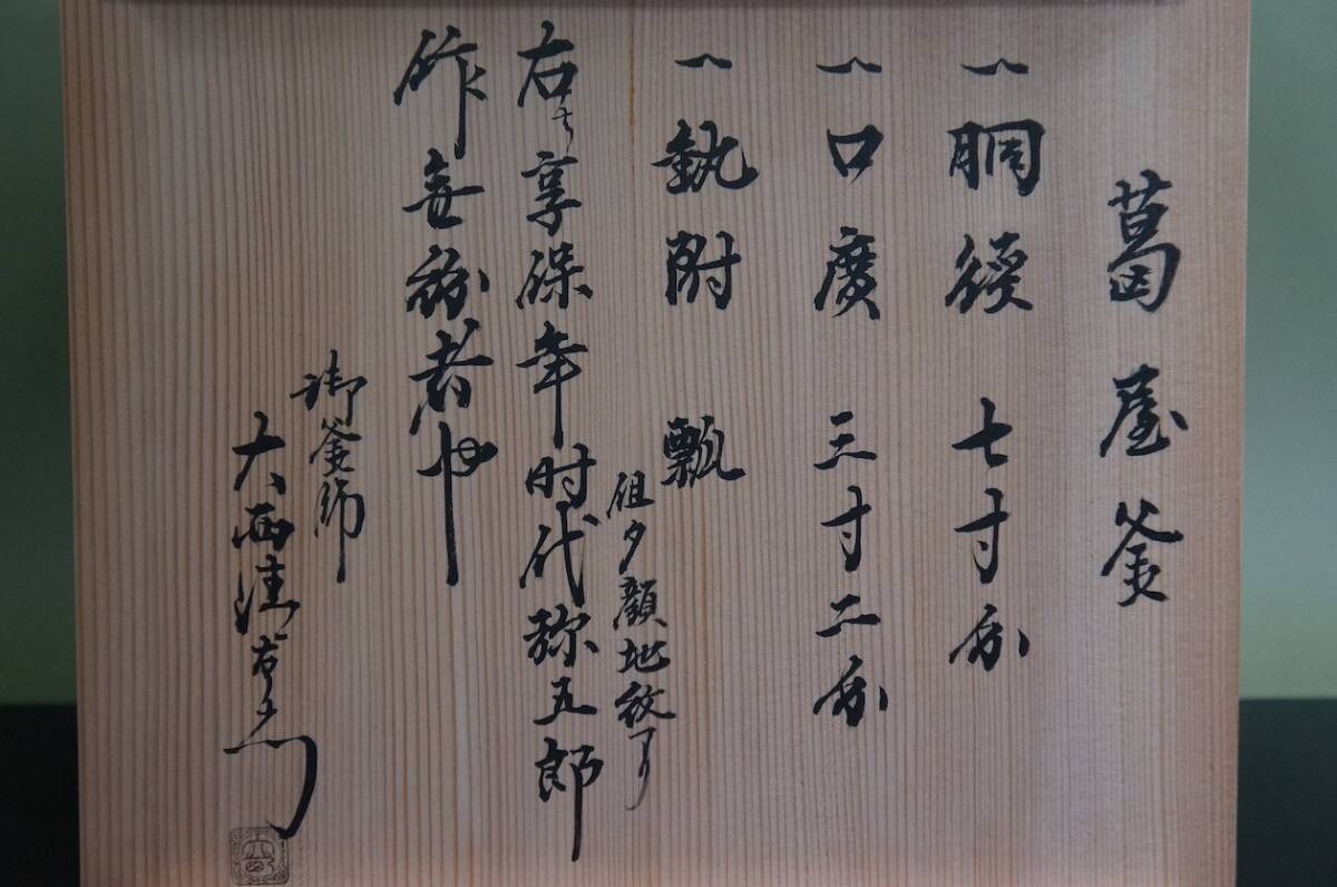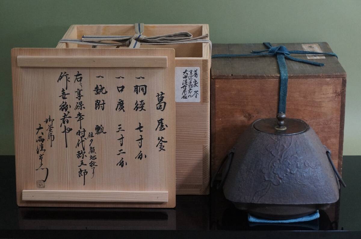 時代を感じる葛屋釜「享保時代 江戸名越家4代名越弥五郎(昌美)・京都大西家 15代大西清右衛門(浄心)極め」(極箱)<釜鐶付き>を出品します。