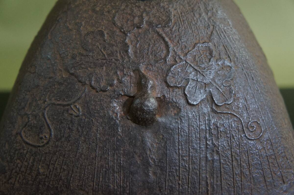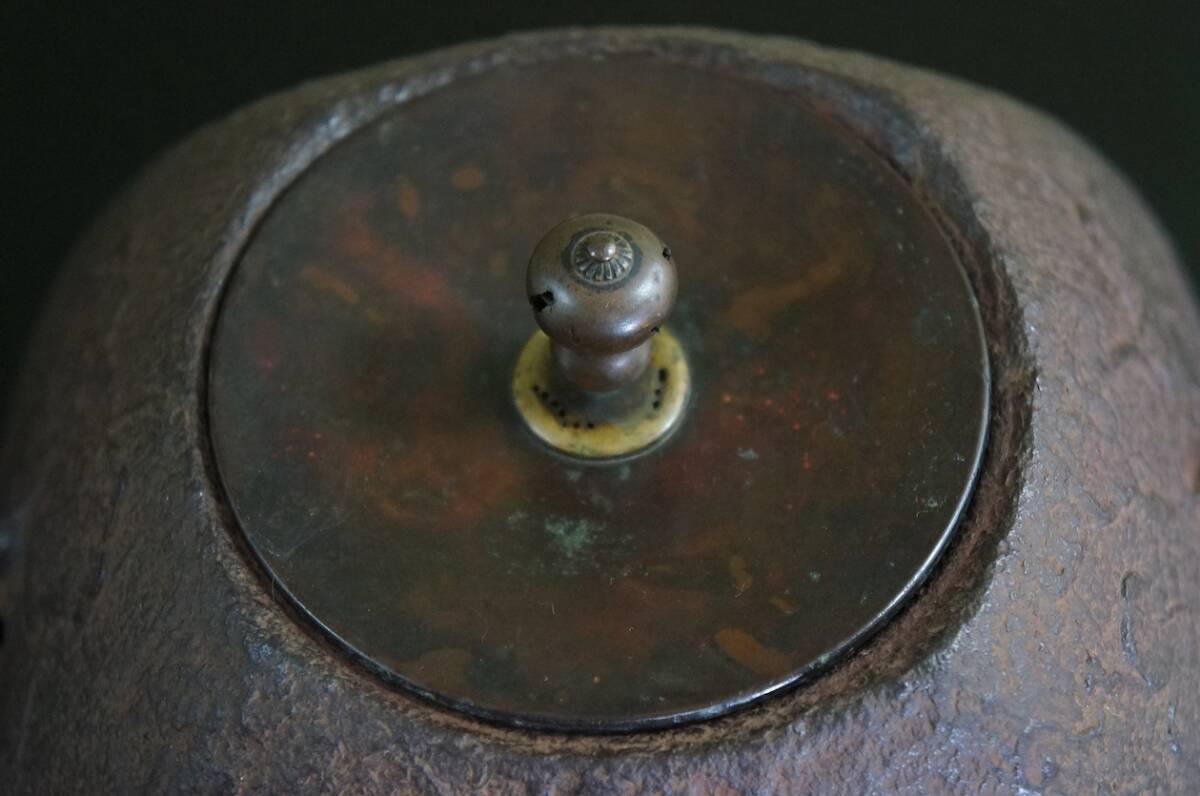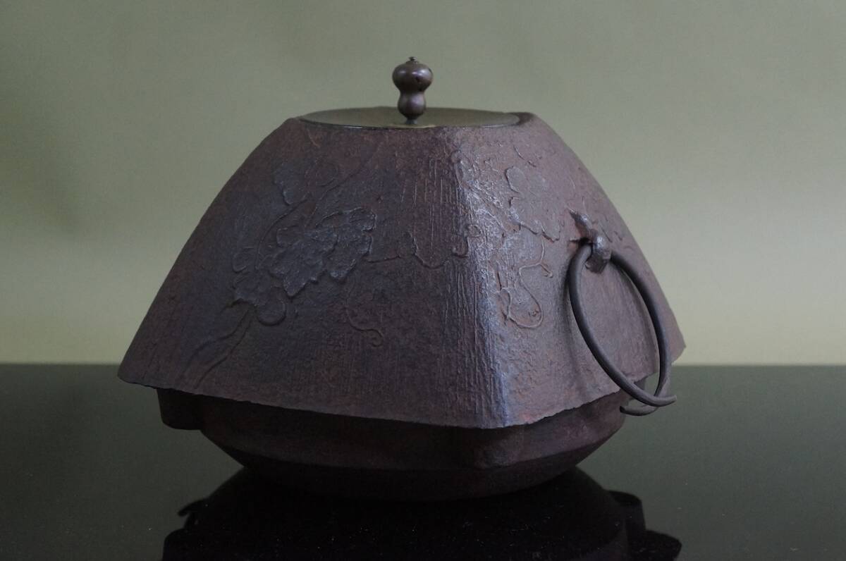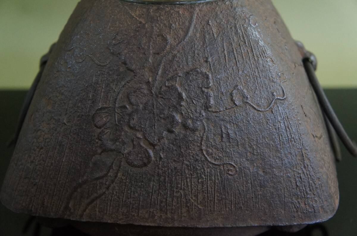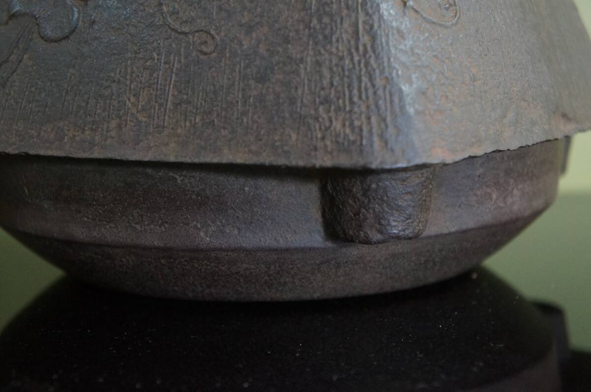 鉄肌の滑らかさや細部まで描かれる地紋などから私見では伊勢芦屋系統にも思えます。線も細く夕顔の表現も写実的ですので時代感としては寛文時代や元禄時代<江戸時代前期>まで上がるかもしれません。底は替わっています。おそらく底替えの時に柱のような装飾を施したのだと思います。