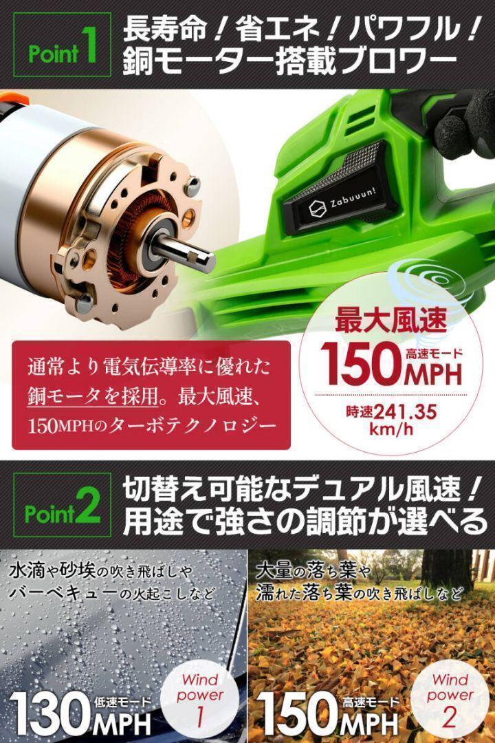 通常より電気伝導率に優れた銅モーターを採用。最大風速150MPHのターボテクノロジー。