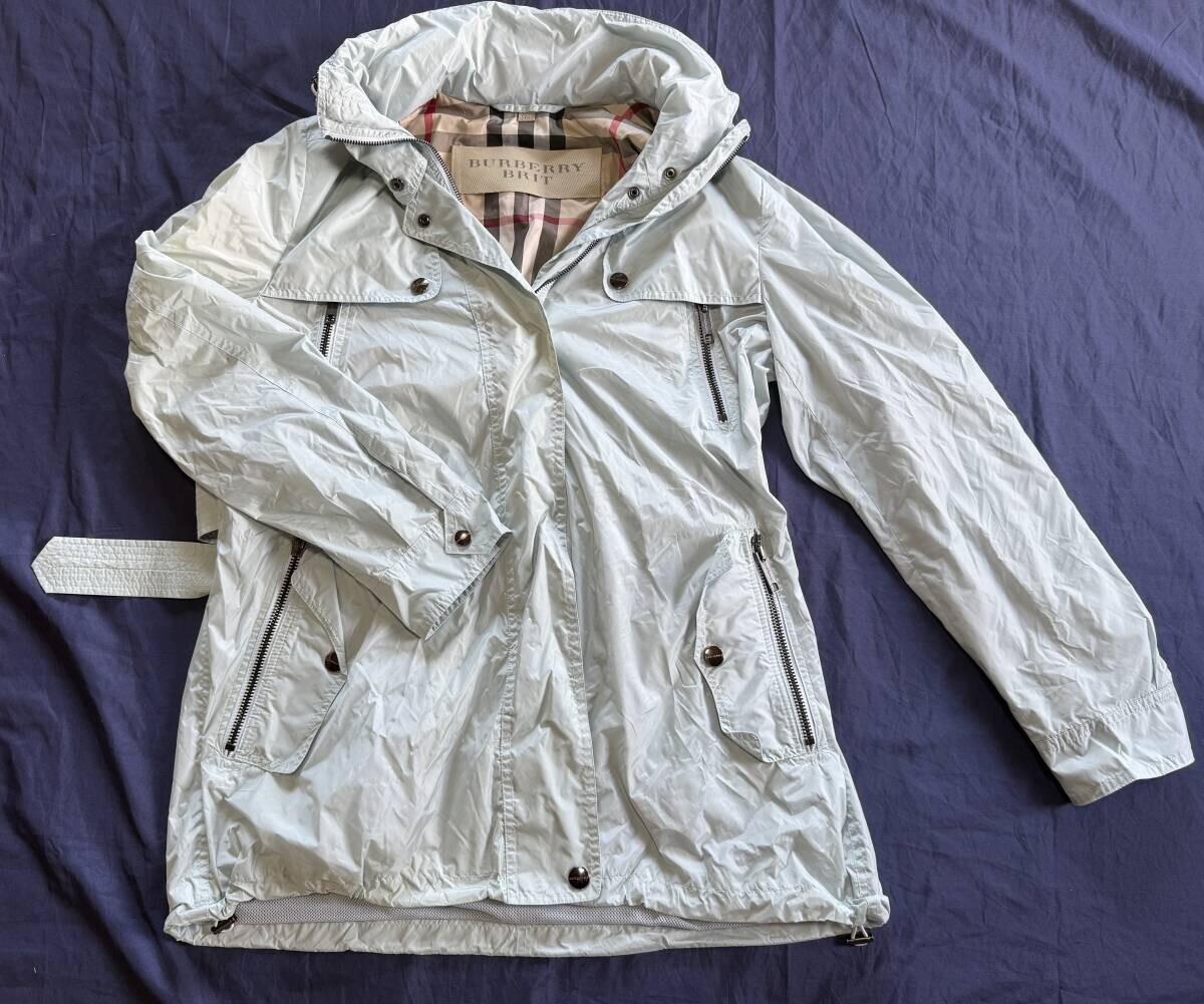 バーバリーブリット コート UK14 高級タイプ 襟にフード収納 ノバチェック ライトブルー