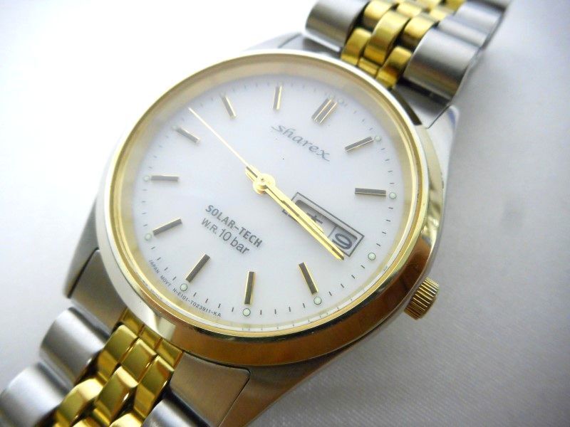 腕時計 Sharex SOLAR-TECH メンズ デイデイト E101-T015361 白文字盤 動品 現在動いています。 日差ほぼございません。 風防に傷ございます。 傷や汚れなどございます。 ケース幅 約36mm(リューズ含まず) カン幅 約20mm 腕まわり 約17cm (素人計測になりますので誤差はご容赦ください) 腕時計と懐中時計のみ何点でも送料変更なしで同梱可。 写真をよくご確認の上、ご検討宜しくお願い致します。 | |||