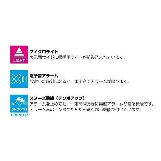 機能:電子音アラーム、スヌーズ機能、ライト電源:単3形マンガン乾電池×1本 (電池寿命約1年)