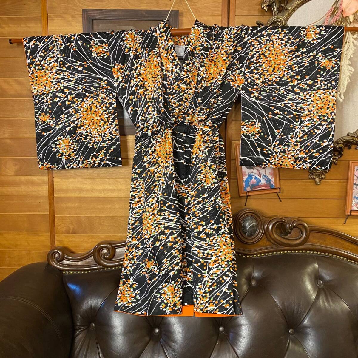 墨黒の地に、刷毛で走らせたような白枝が斜めに奔り、橙と若草の粒が南天の実のように弾けるモダン柄。ほの艶が粒の煌めきをやわらげ、柿橙の帯サッシュが色を拾って全体をキリッと束ねます。黒の組紐タッセルが揺れ、和モードの余韻を結ぶ一着。