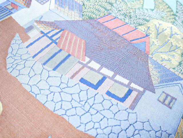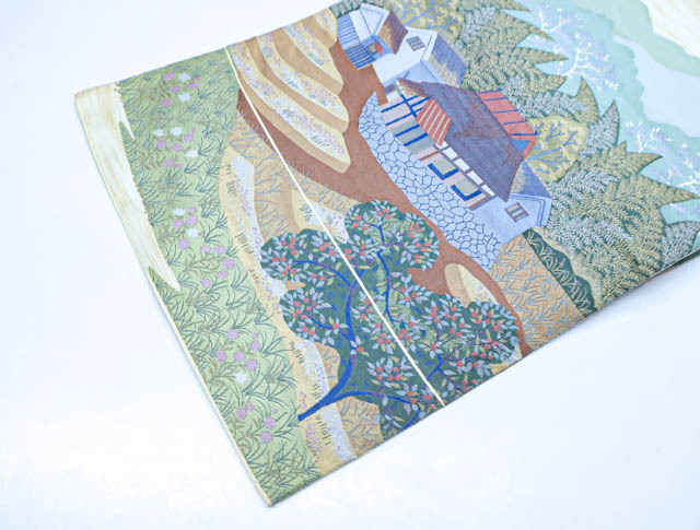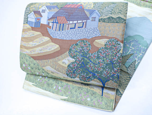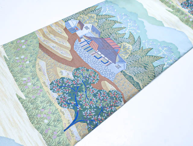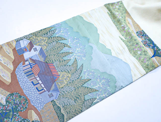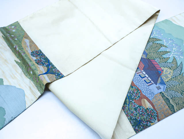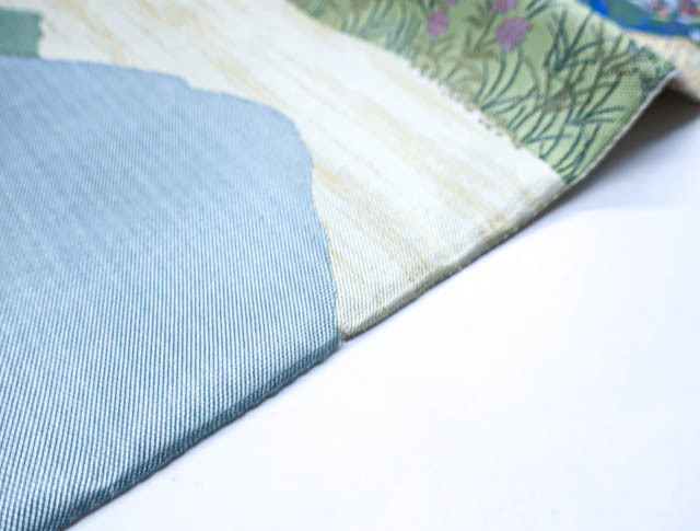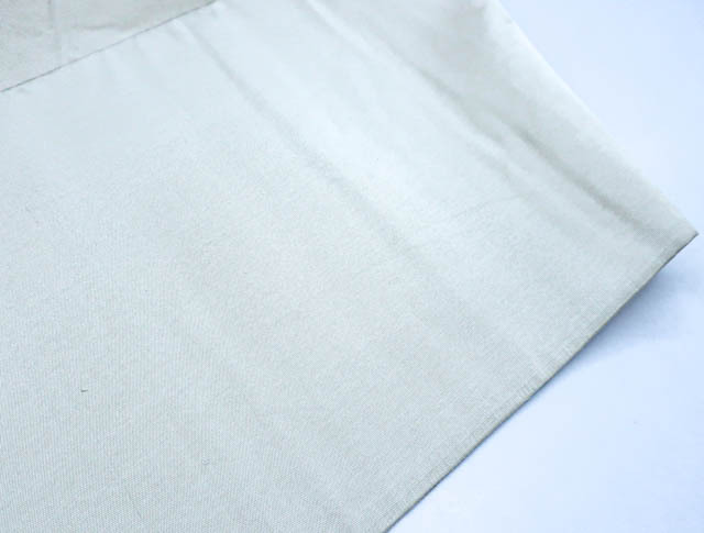 リサイクル商品のため、全体的に耳が黒ずみ、裏地に薄汚れがございますが、着用可能なお品です。 地色は、くすんだ黄色です。 1枚目の画像が近いお色かと思われます。 素材は正絹です。 |